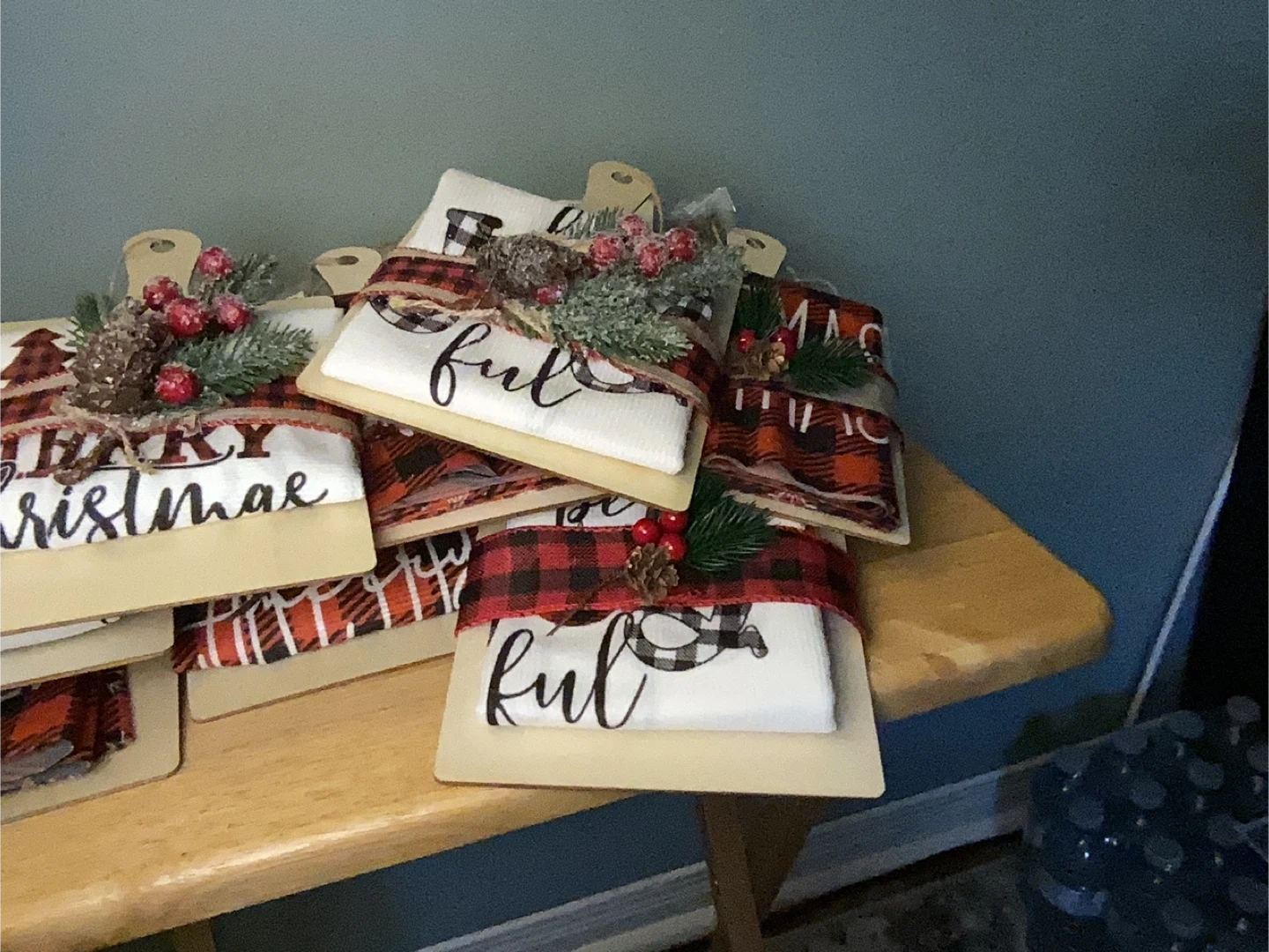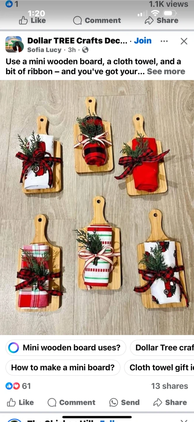 Great Christmas crafts for teacher neighbor, cutting boards with a tea towel, hot chocolate kits and more to come starting at five dollars
