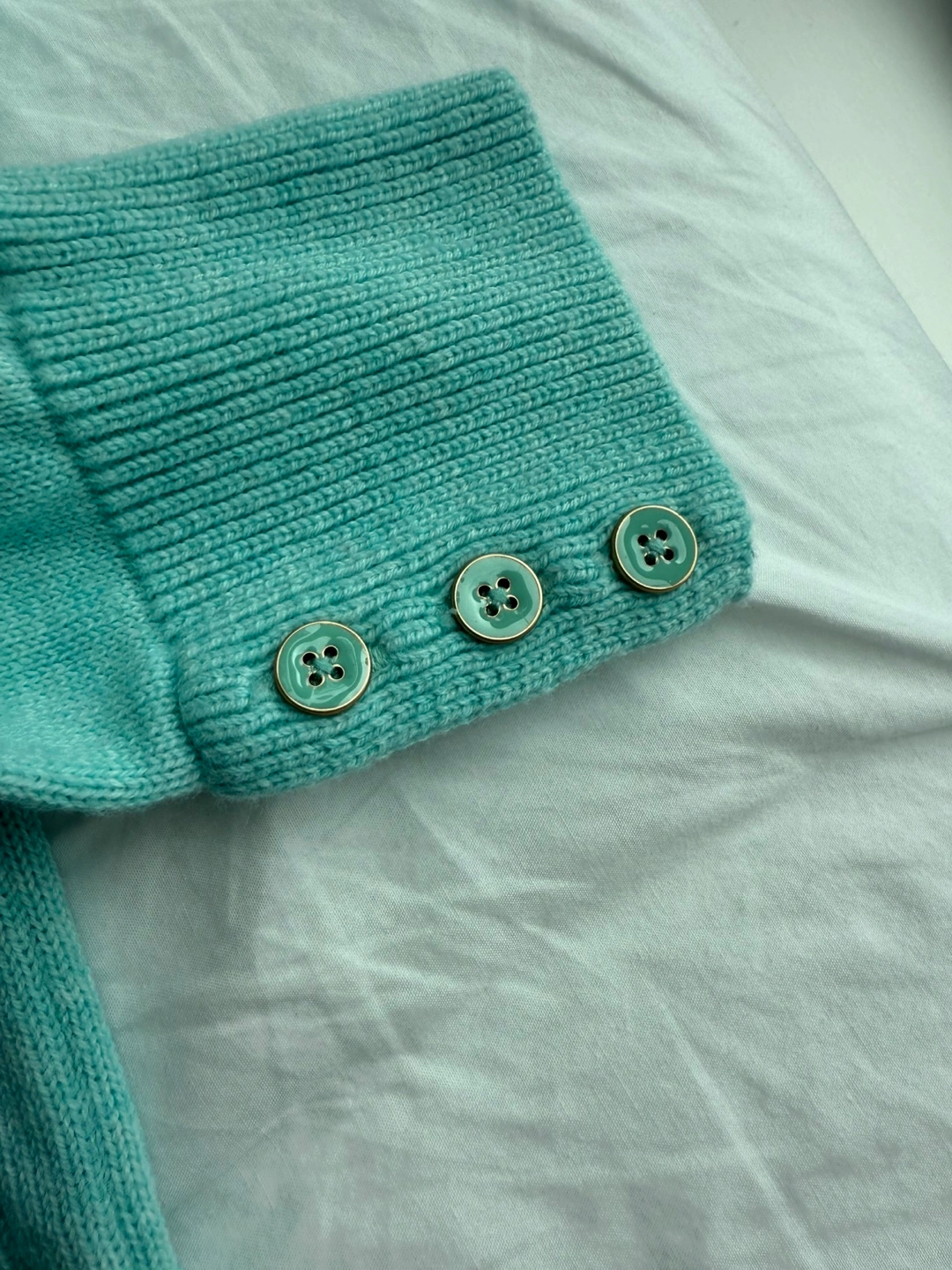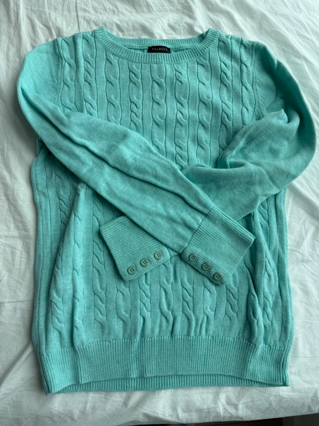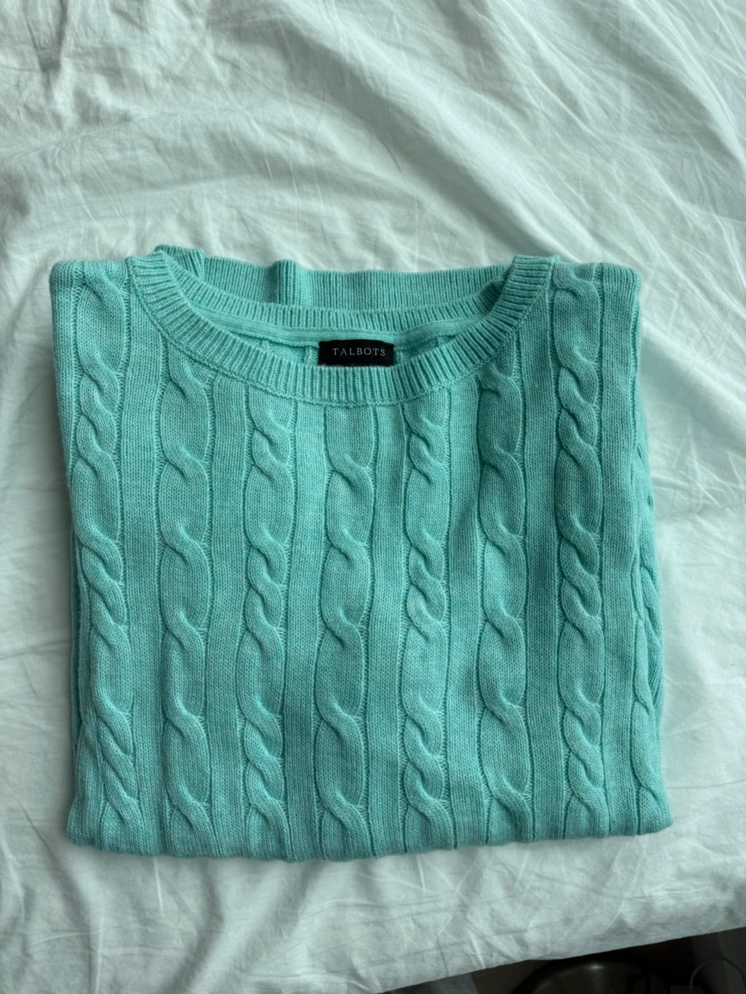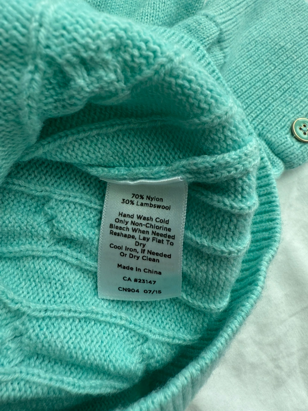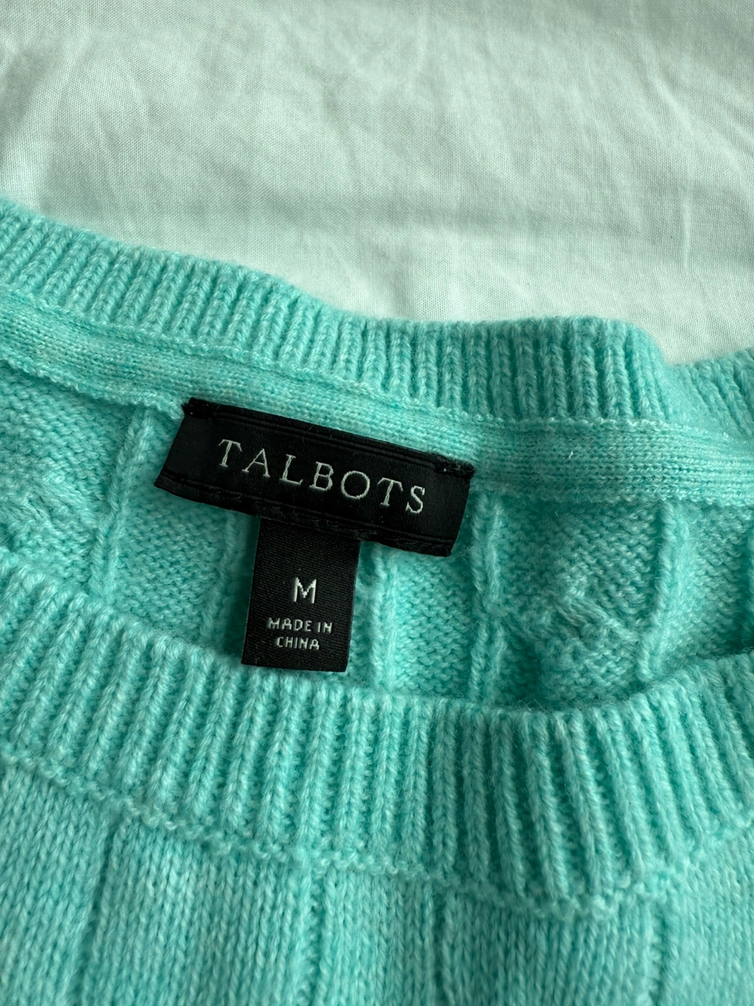 80Here's a lovely Talbots cable knit sweater in a soft, light blue colour! It's a size medium and made of 70% nylon and 30% lambswool. It features cute button details on the sleeves.