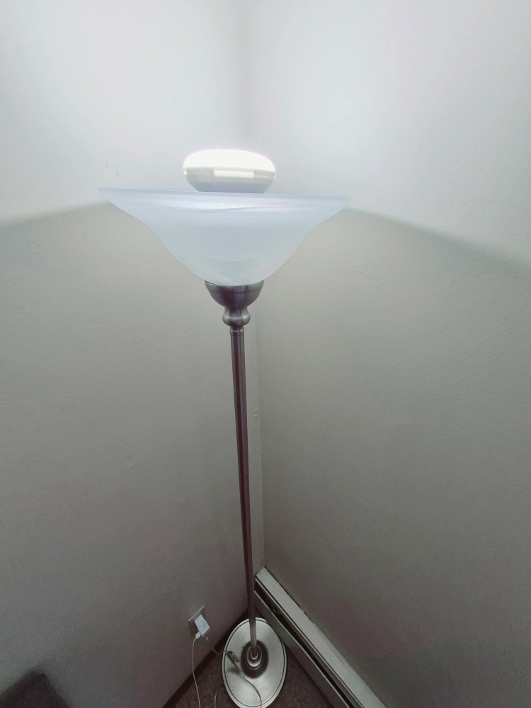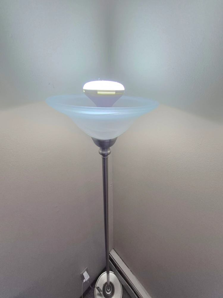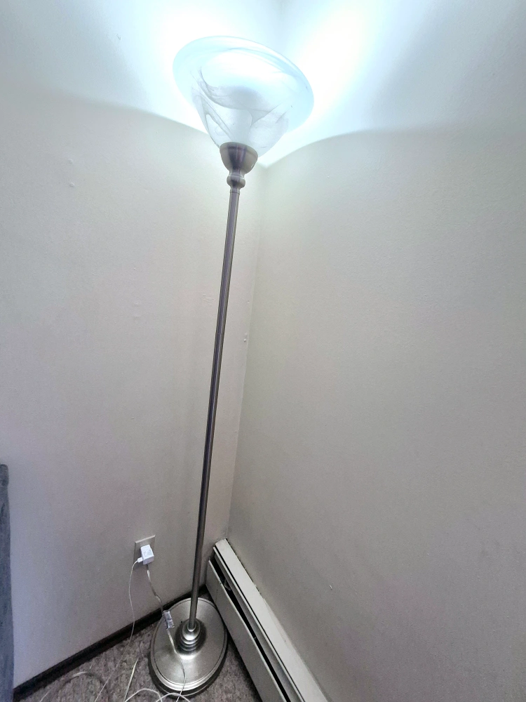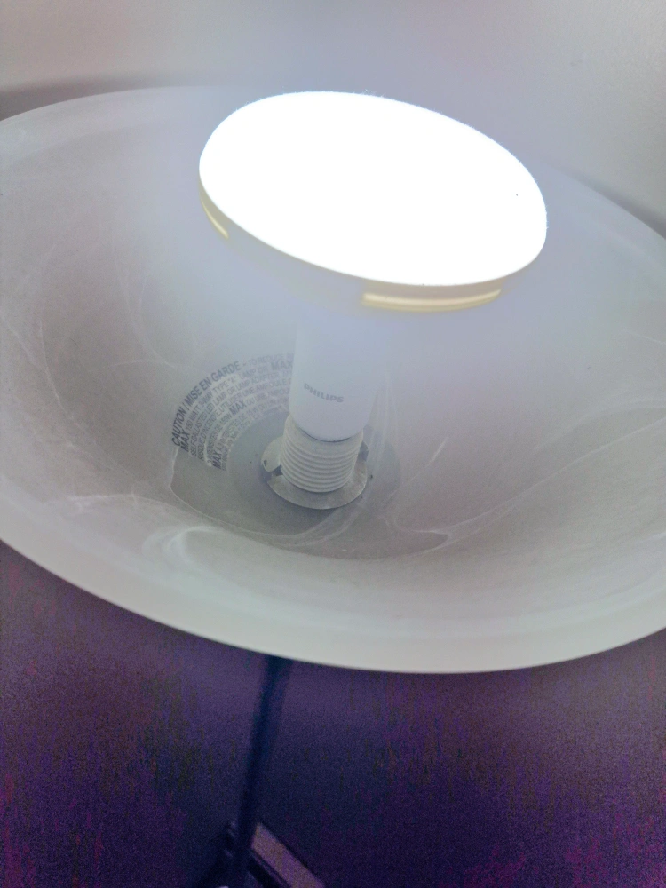 Elegant floor lamp, brushed nickel finish. Features a wide, frosted glass shade. Great for ambient lighting. Includes a Philips LED bulb.