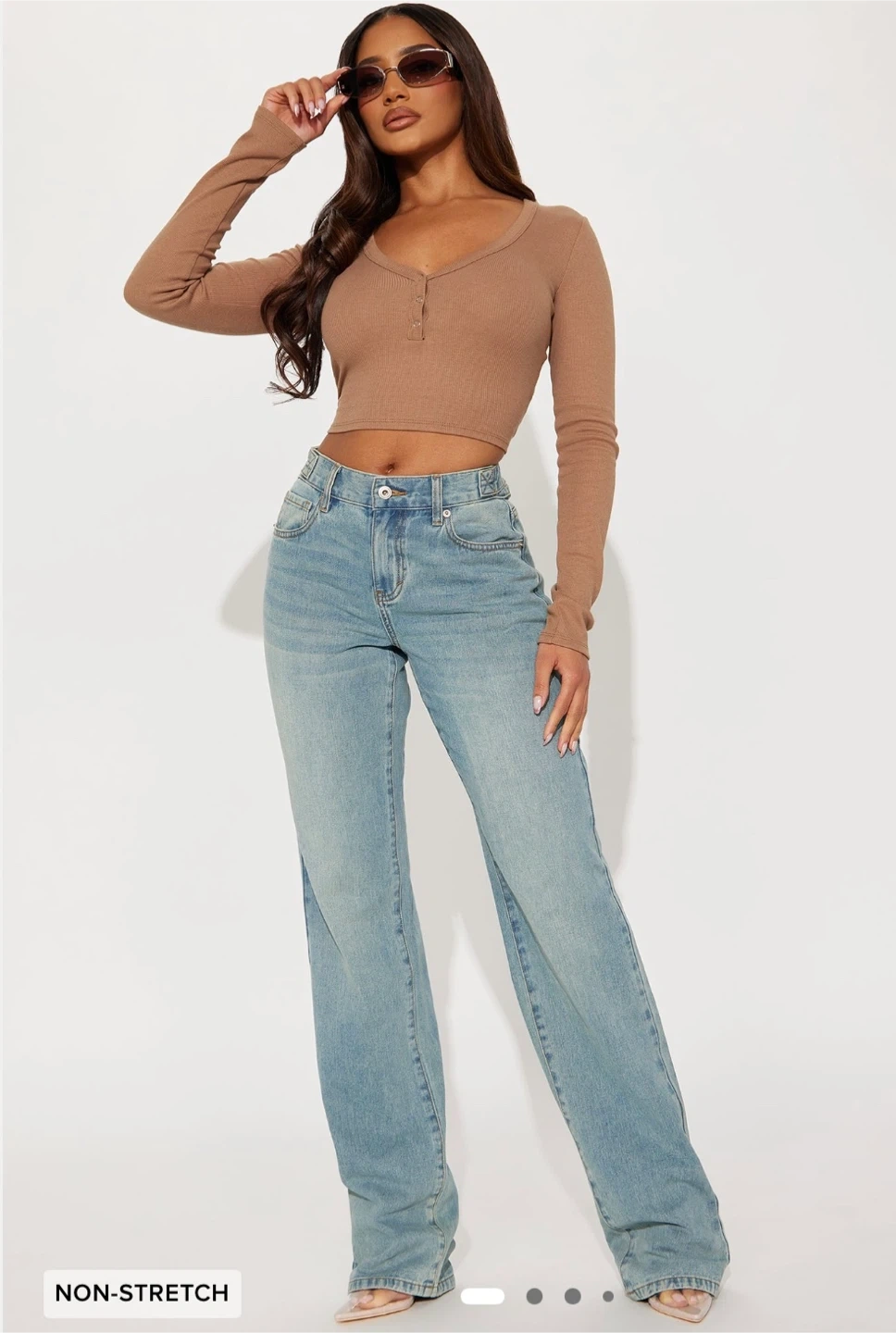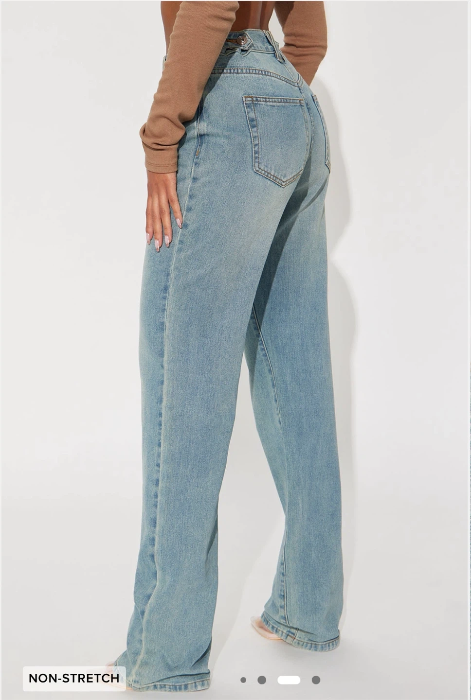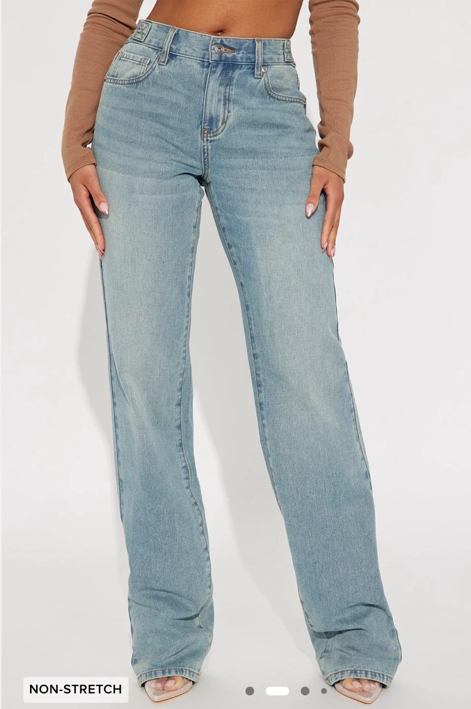 5These are a pair of light wash, wide leg jeans from Fashion Nova. They are non-stretch denim. Inseam of 36” perfect for tall ladies. I’m 6’2 and the length is perfect!