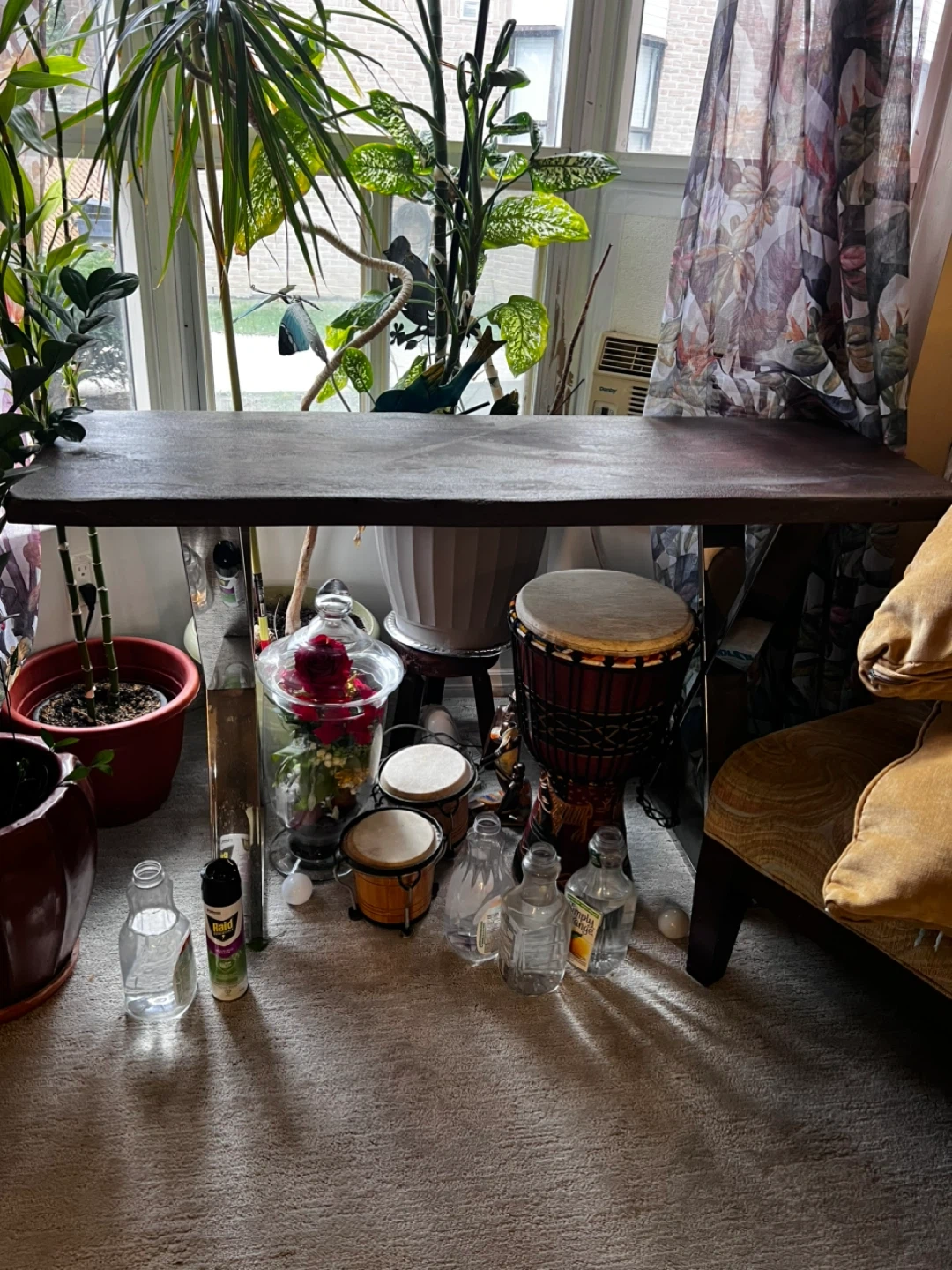 Selling a sturdy wooden table in a dark brown finish. It's in good condition and would be great for any room in your home Silver tone study base.