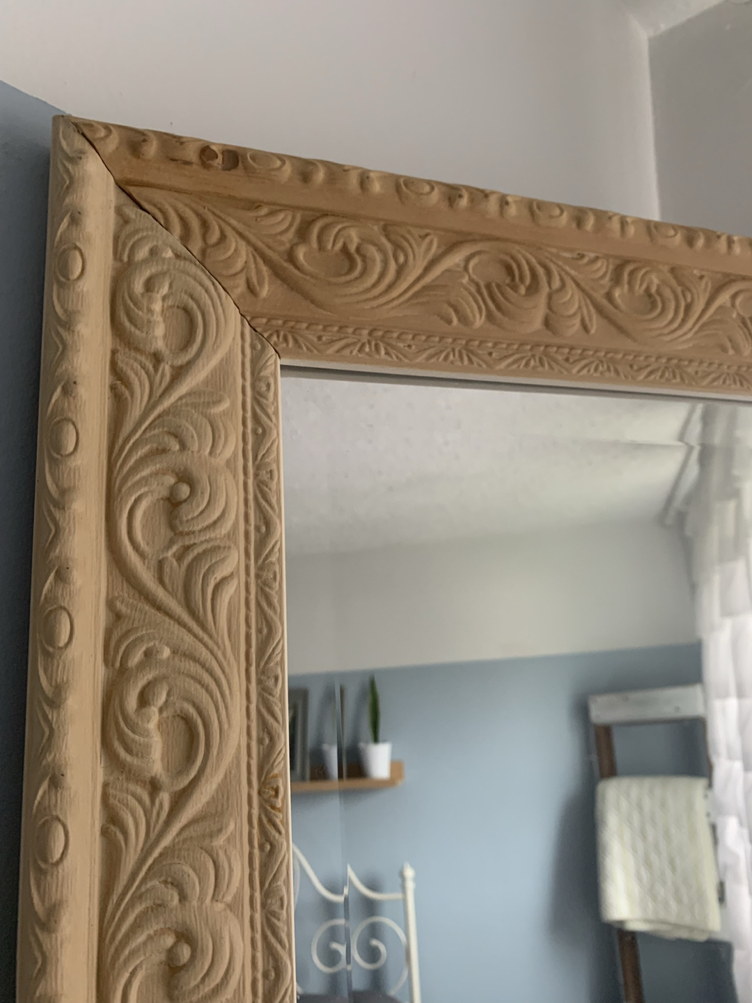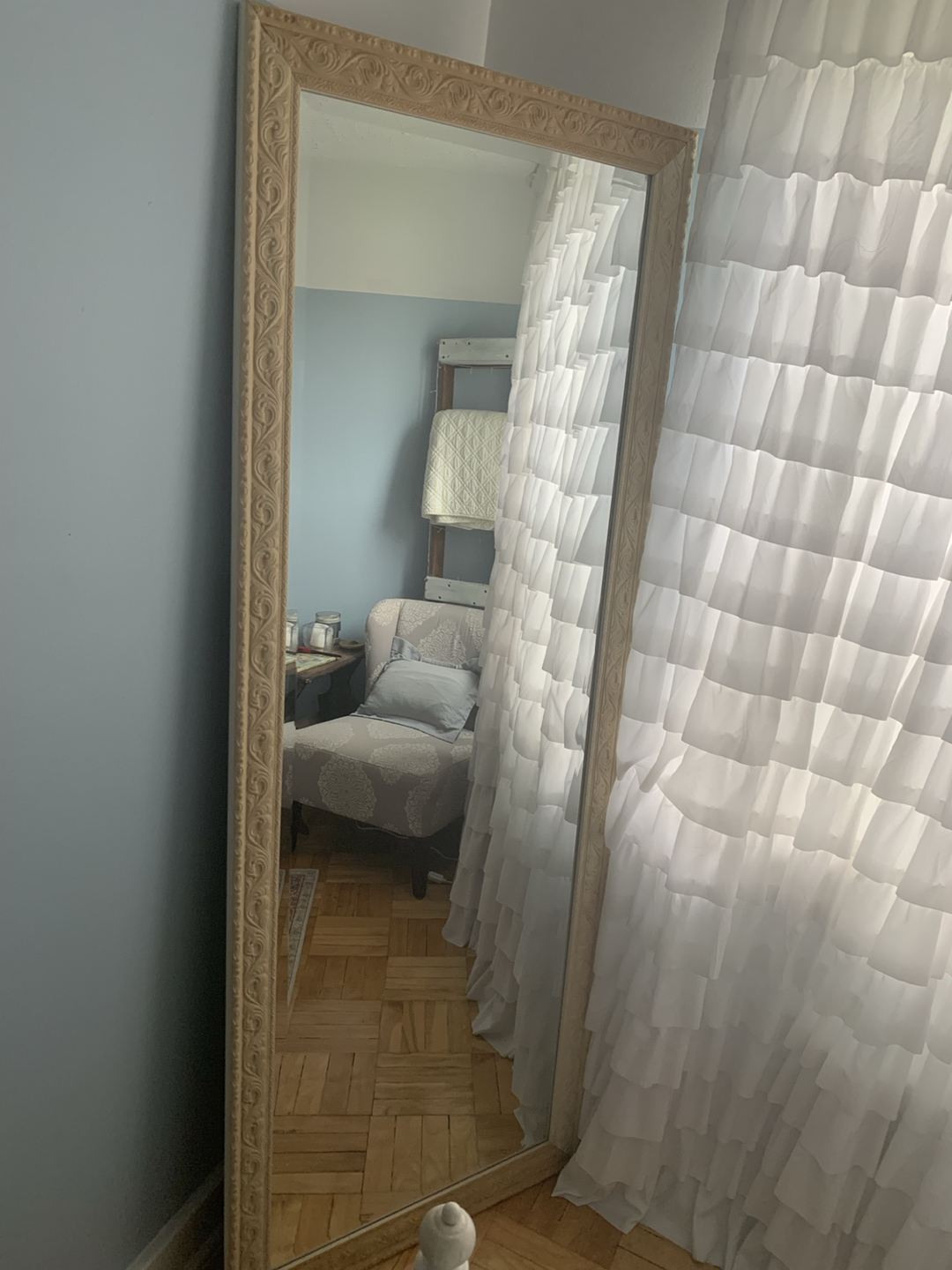 577”h x 29.5”w. I originally painted this mirror with chalk paint and then waxed to seal it, so the top and bottom pieces are a little darker than the sides. Its a beige color, very beautiful statement and useful piece. Please see my other ads, we are moving and need all items gone asap. Thanks!! Home sense. Pottery barn. West elm. Urban barn. Anthropologie. Pier one. Shabby chic. French provincial. Bohemian.