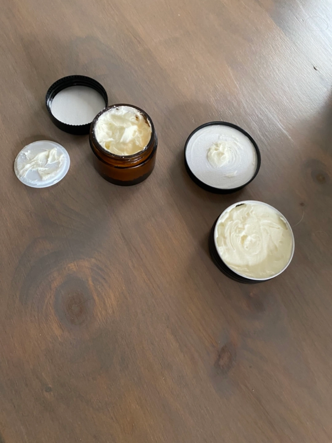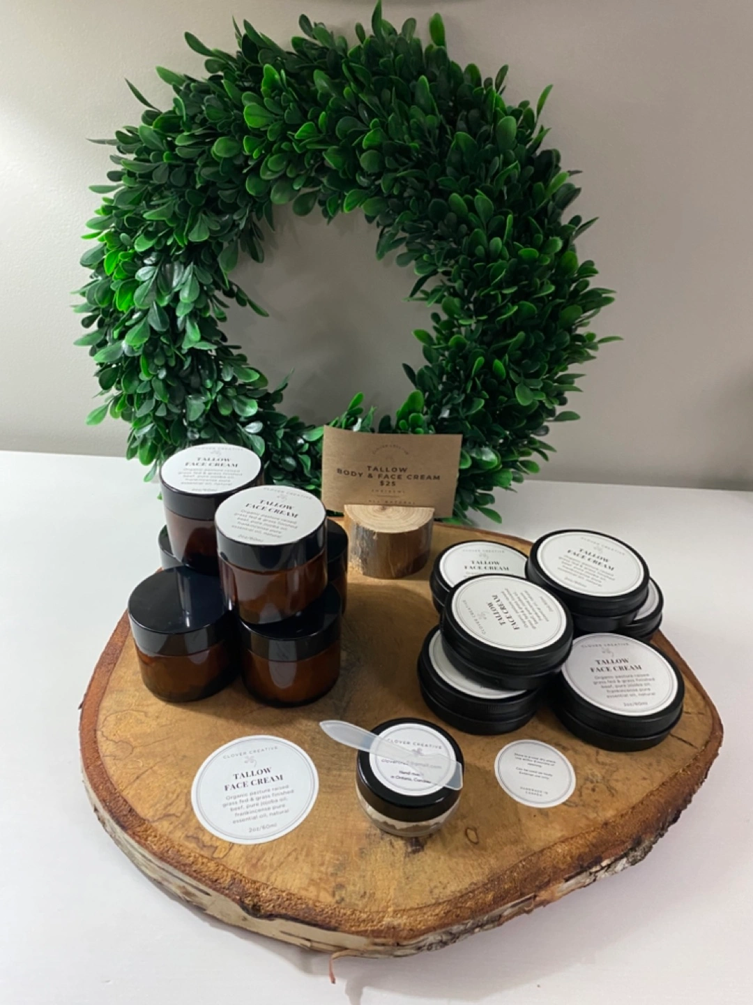Homemade. It contains organic pasture raised, grass fed & grass finished beef, pure jojoba oil, and frankincense pure essential oil. It's a natural body & face cream and comes in a 2oz/60ml container (either amber glass jar or tin). Recommended to store in a cool dark place and it may be refrigerated if you like. Use within 3 months of opening. NEW NATURAL Choice of container: A. Amber glass jar 2oz/60ml OR B. Tin 2oz/60ml I have made approximately 20 containers. I will have labels on containers. “Potential Benefits of Tallow: Deep Moisturization: The fatty acids in tallow are similar to those found in human skin, making it deeply nourishing and perfect for dry or chapped skin. Vitamin-Rich: Tallow contains vitamins A, D, E, and K, all essential for skin health. These vitamins promote cell regeneration, repair damaged skin, and reduce inflammation. Anti-Aging: Tallow’s ability to promote cell regeneration can reduce the appearance of fine lines and wrinkles over time, giving your skin a more youthful appearance. Healing Properties: With its rich nutrient profile, tallow can help heal minor skin irritations, sunburn, and even eczema or psoriasis. Non-Clogging: Tallow is non-comedogenic, meaning it won’t clog your pores, making it ideal even for sensitive or acne-prone.”