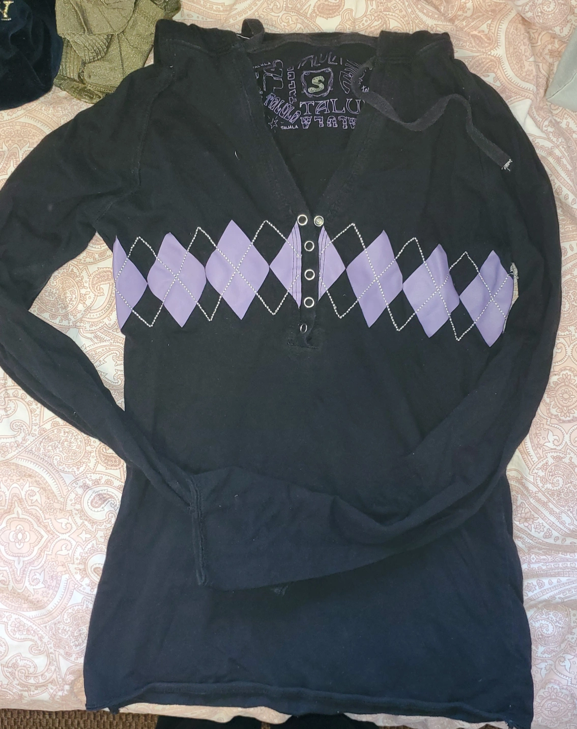 48This is a black long-sleeved shirt with a purple diamond design. It has a hood and a button up front. please ask about bundles on multiple items from my page!