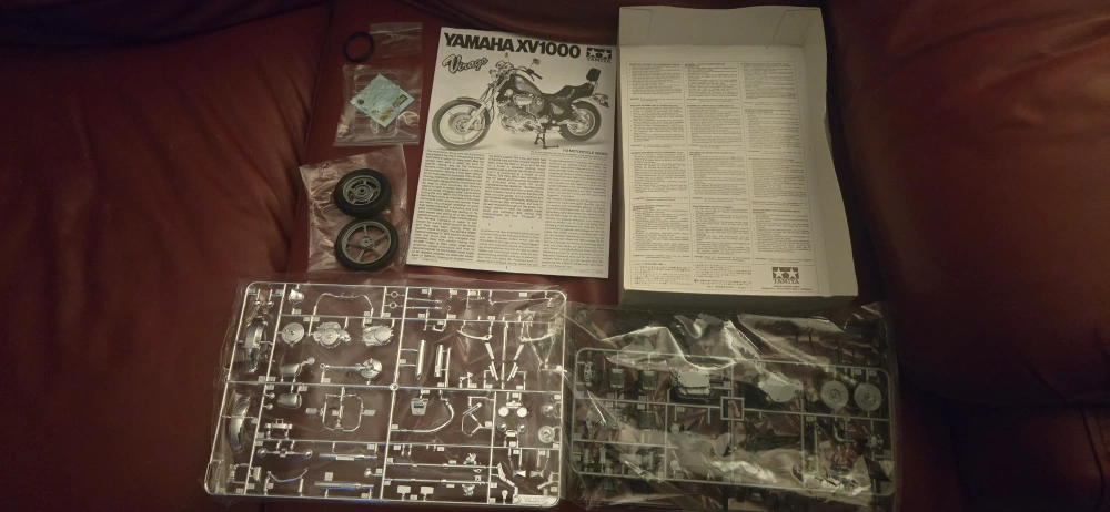 65Selling a Tamiya 1/12 scale model kit of the Yamaha XV1000 Virago motorcycle. The kit is complete and includes all the parts, tires, decals, and instructions. Box is included, but missing off sprue is the tire rims already installed by previous owner. A fun project for model builders!