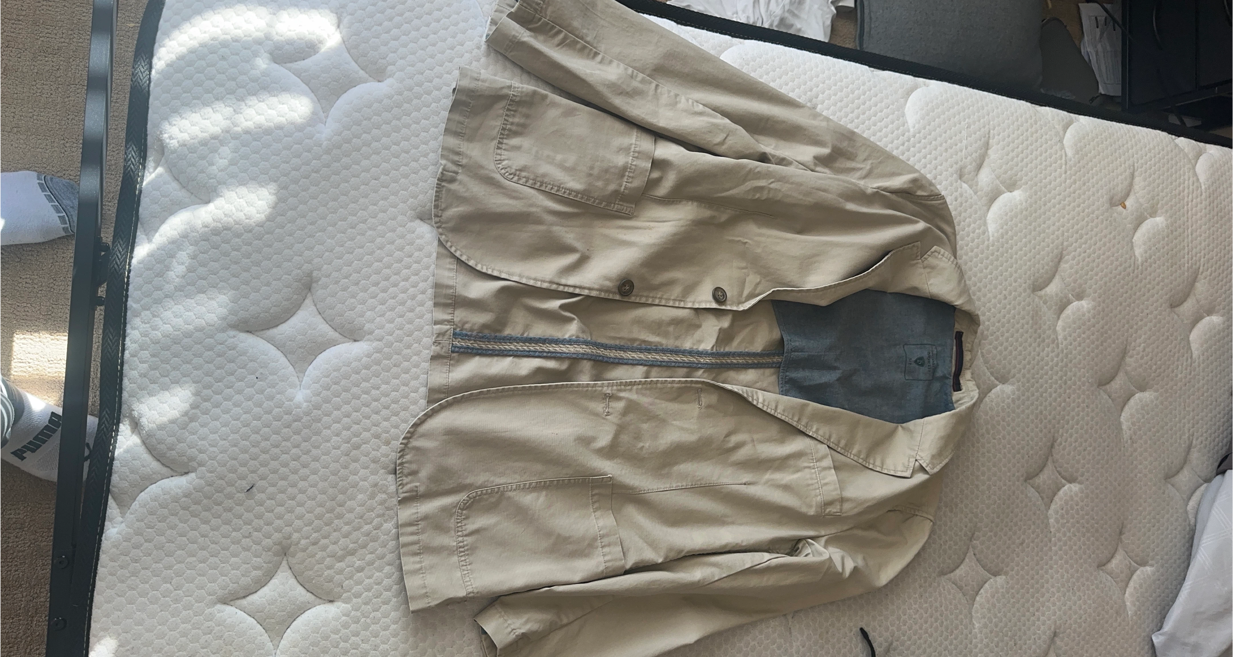 Selling a tan blazer jacket. It's in great condition and ready for a new home! It has a light blue denim inside.