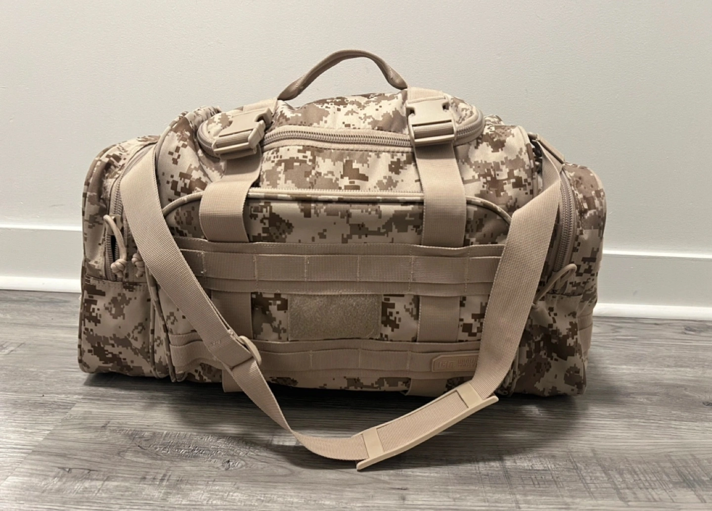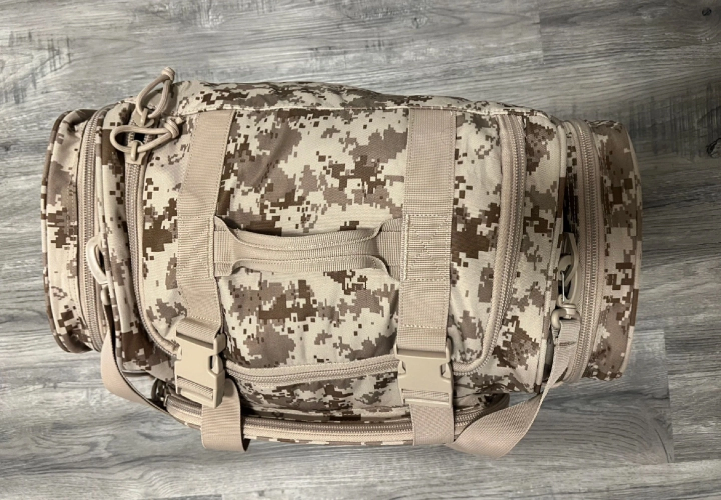 1000+Durable duffel bag. Tan and brown camouflage pattern. Multiple pockets and compartments. Adjustable shoulder strap. Perfect for travel or the gym. Like new