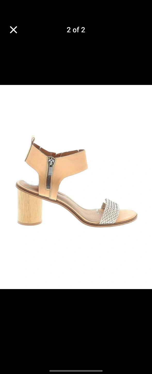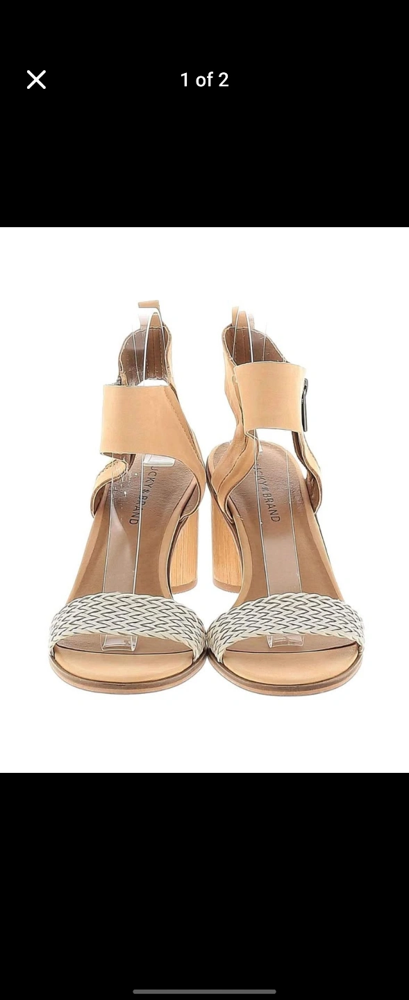 62Women's tan leather sandals. Block heel. Ankle strap with zipper closure. Woven detail on the toe strap. Stylish and comfortable. Lucky Brand.