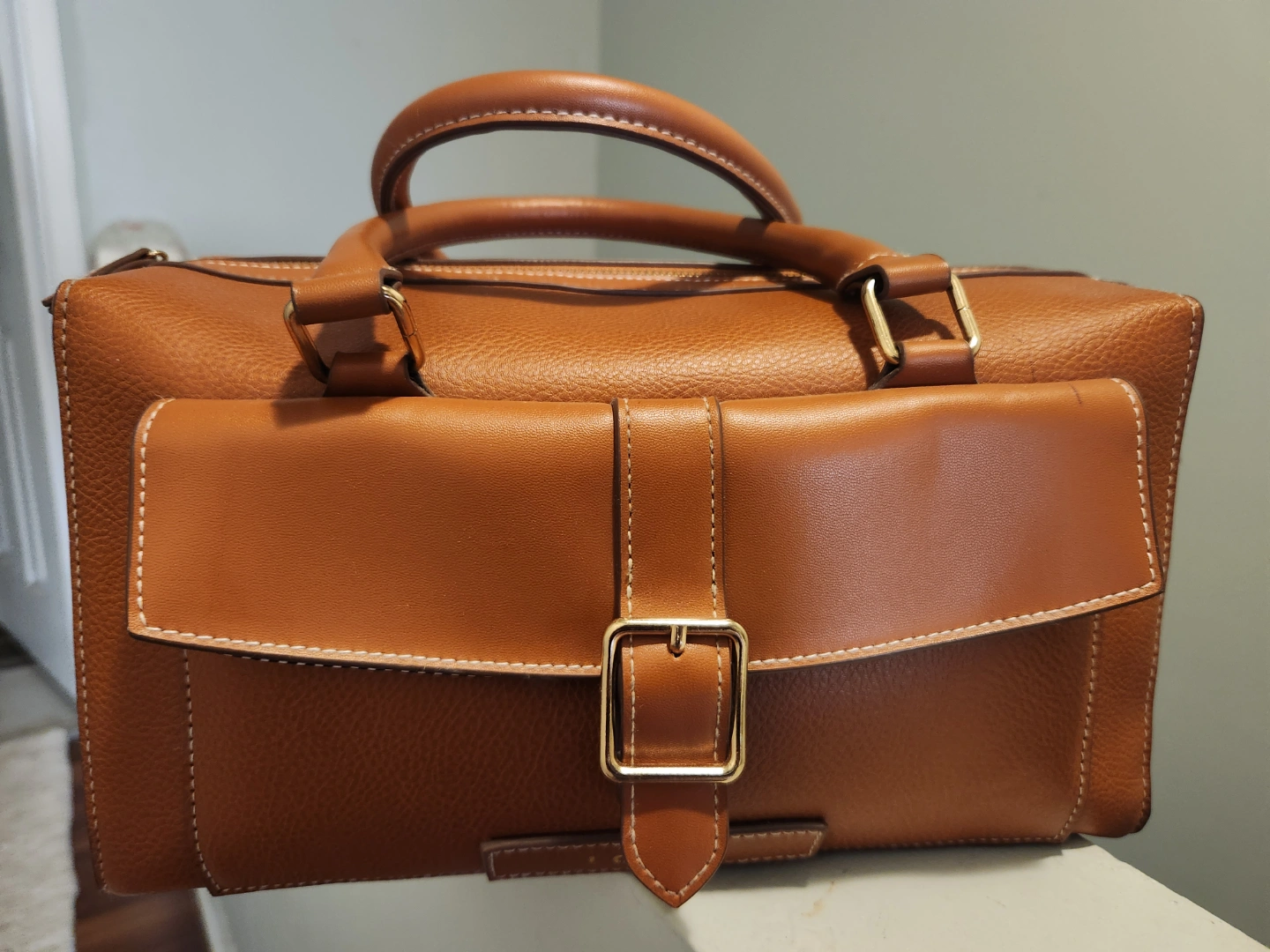 Beautiful tan leather satchel. Gold-toned hardware. Interior features striped lining and pockets. Double top handles. Perfect everyday bag. Lots of room inside.