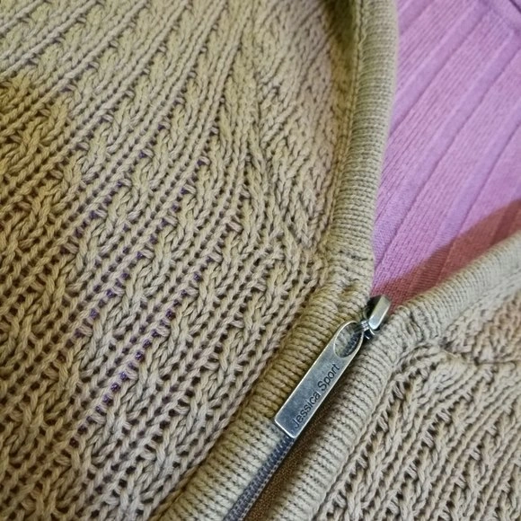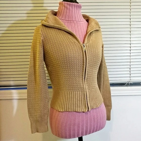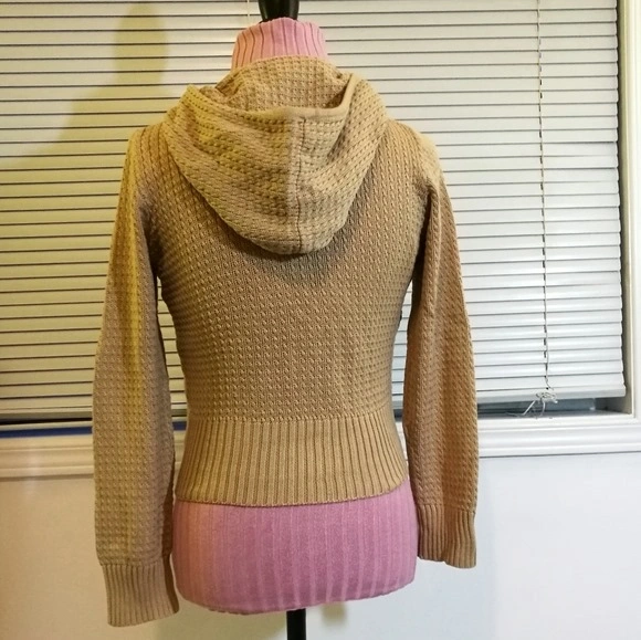 15Cute Jessica Sport light brown or tan colored zip up knit sweater jacket with hood. Great condition. Washed and clean. Size S. Smoke and pet free home.