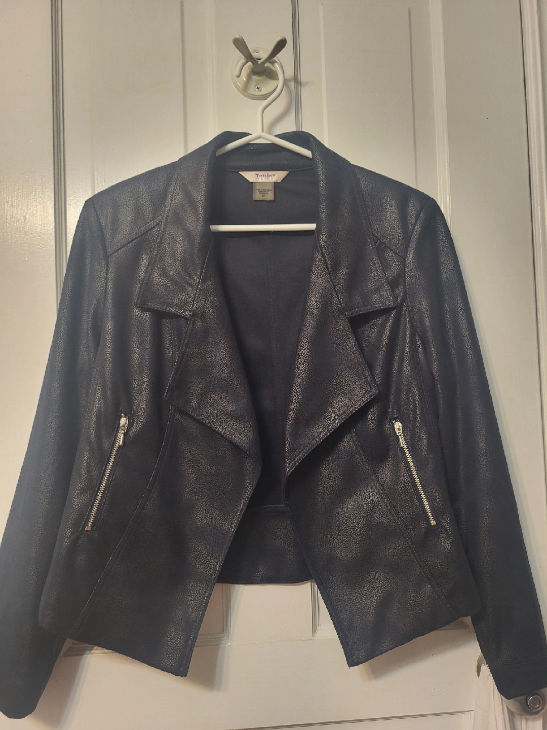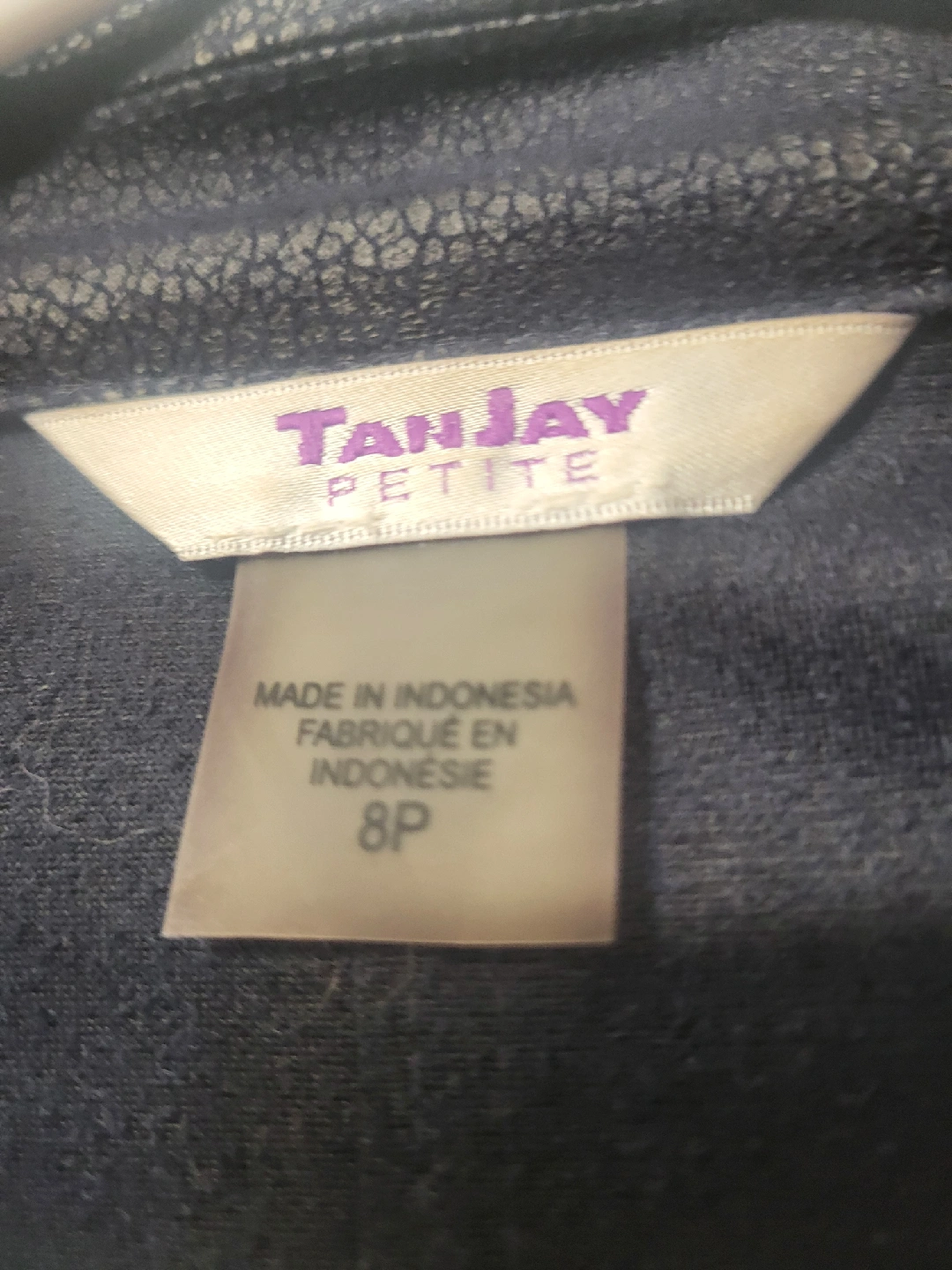 Here's a Tanjay Petite jacket in a sleek black colour! It's a size 8P. This jacket is perfect for adding a touch of edge to any outfit. The material is comfortable and stylish, making it a great addition to your wardrobe