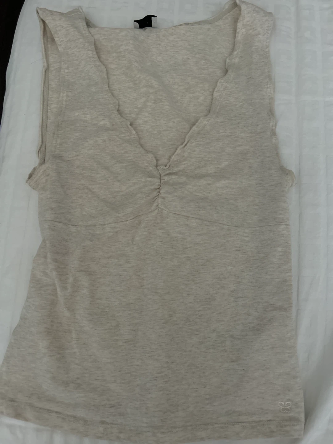 Selling a beige tank top. It's in great condition and perfect for summer! The material feels soft and comfortable. There is a small logo on the bottom right.