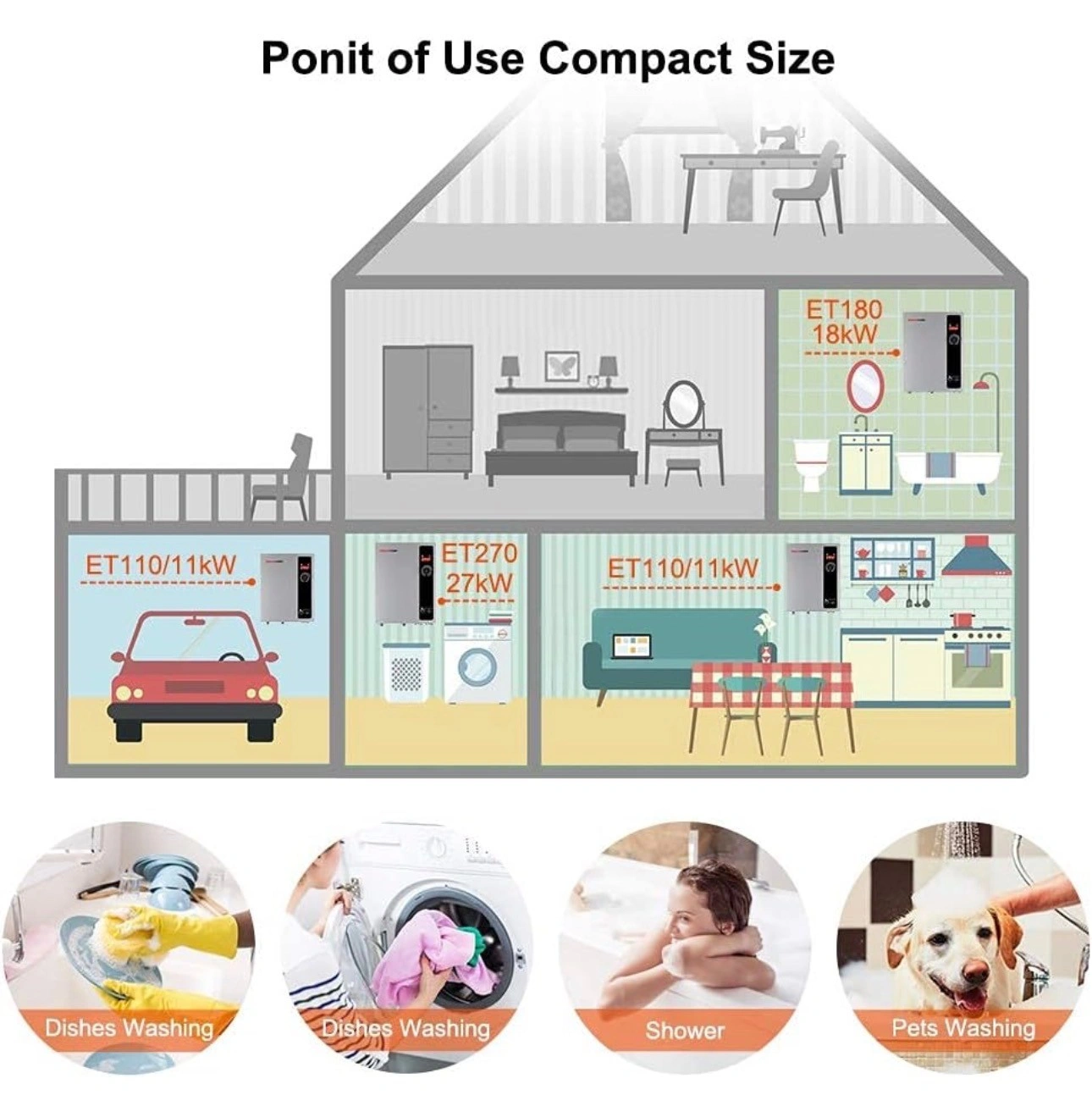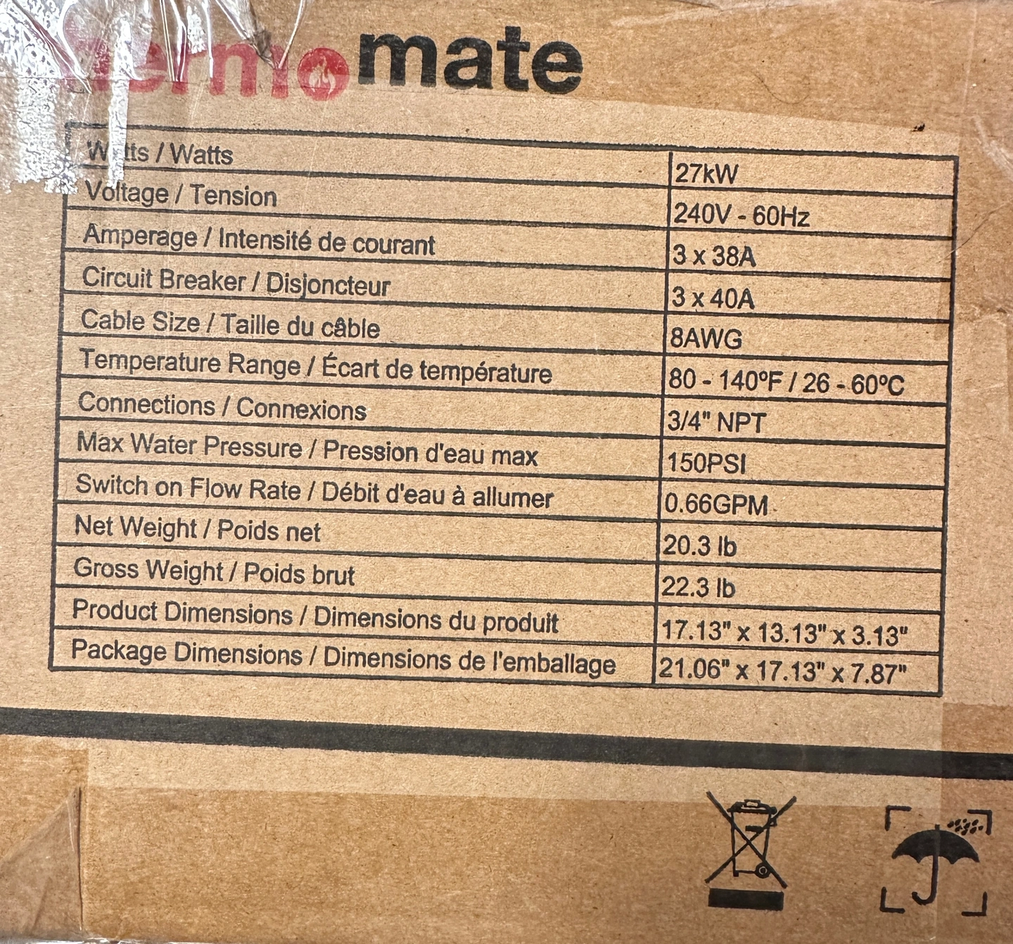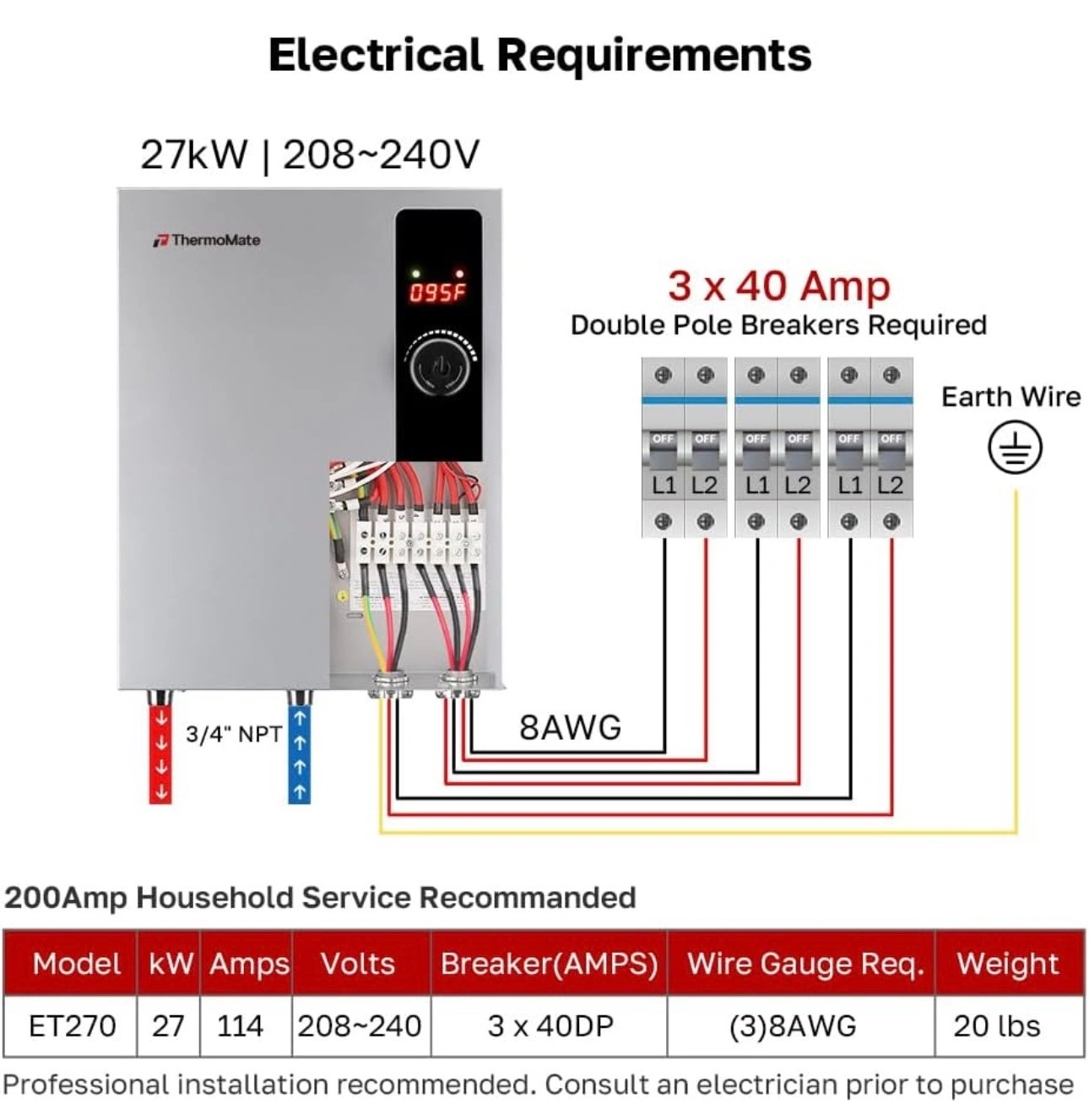 306Tankless Water Heater Electric 27kW 208~240 Volt, ThermoMate On Demand Instant Endless Hot Water Heater, Digital Temperature Display for Residential Whole House Shower NOTE: New in box, Model: ET270 [Instant Unlimited Hot Water] - On demand tankless electric water heater, providing hot water in 3 seconds when you need it and as long as you need, eliminating wait time, never run out of hot water again and No More cold shower. Flow Rate 5.27GPM @35°F Rise. Requires 120Amp breaker (3 Sets of Double-pole 40AMP Breakers) [Self-modulating Power] - Self-modulating technology regulating the amount of energy required to heat water only when you need it with 99.8% efficient, saving up to 60% on water heating cost comparing to traditional tank water heater. Wall mounted compact size with no water tank, convenient for any spaces, saving floor space and fitting into tight spaces. [Stable Water Temperature] - Auto adjusting energy consumption basing on income water temperature and flow, ensuring maximum efficiency, continuous stable temperature and optimal power usage. Digital temperature display allowing adjustment in 1° increment from 80°F to 140°F. Heating element separated from water tube significantly reducing scale, corrosion and mineral buildup on the element, achieving better performance and low maintenance. [Easy Installation & Safety Protection] - ETL certified with overheating protection, auto stop heating when detecting no water, quality workmanship for leakage protection NOTE - Make sure this water heater is the correct size for your hot water need: 27kW 208 ~ 240V (adjustable) draw max 114Amp; Required breaker: 3 x Double-POLE 40AMP; Wire gauge 3 x 8AWG; Unit size 17.12" x 13.12" x 3.12"; Water connection 3/4" NPT
