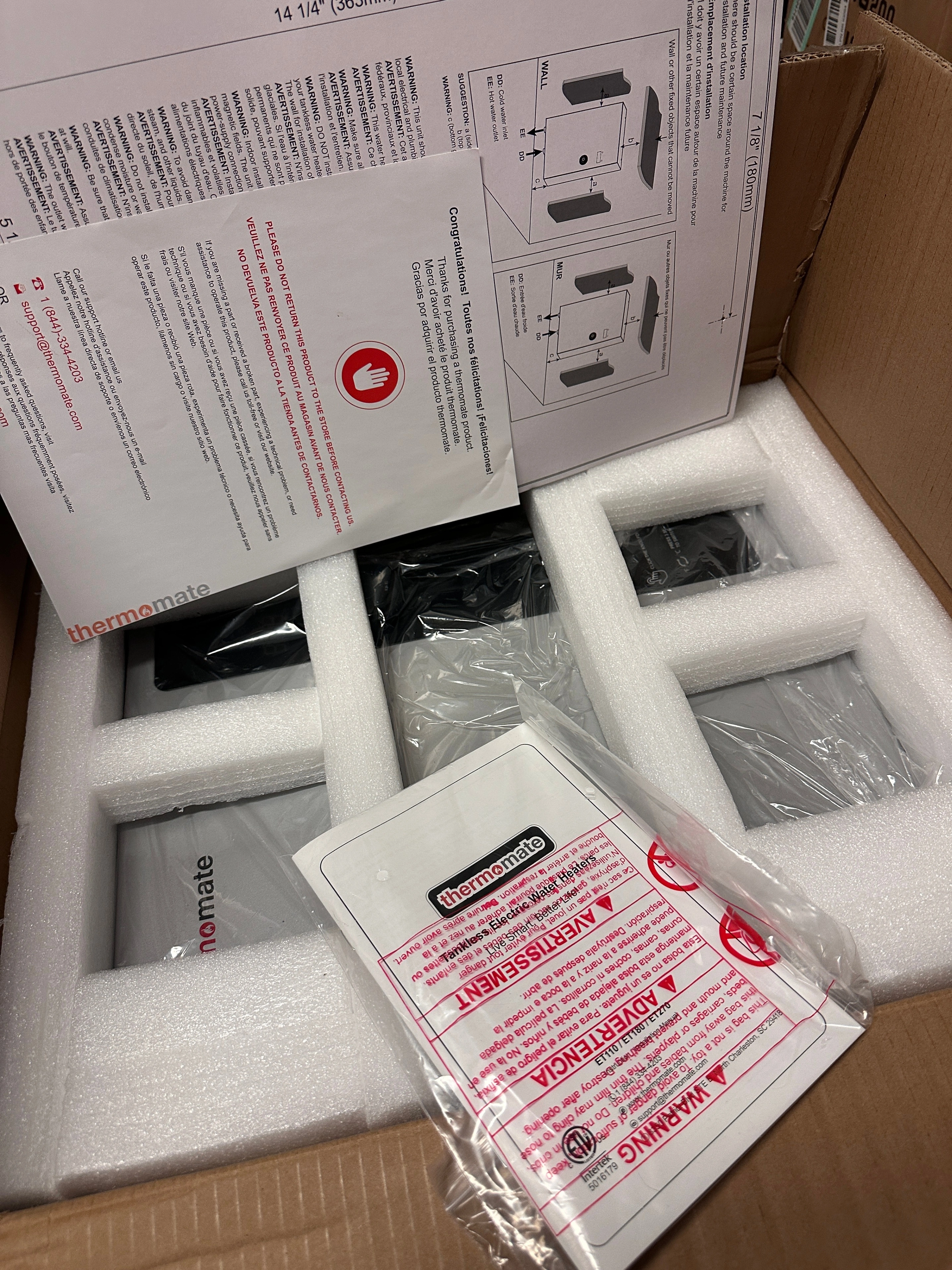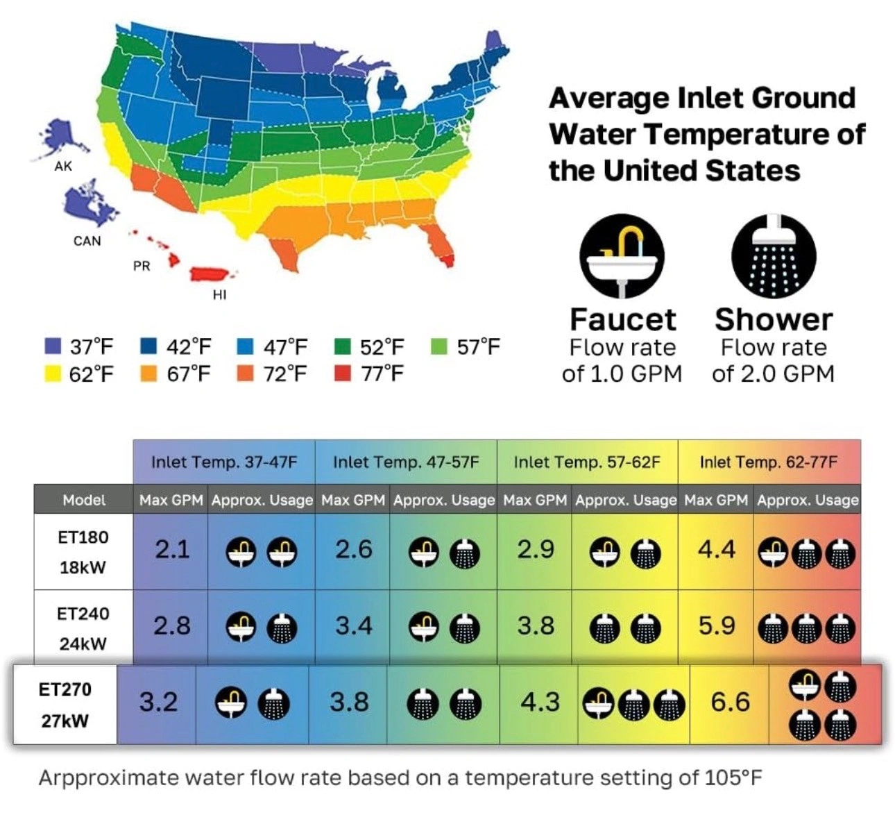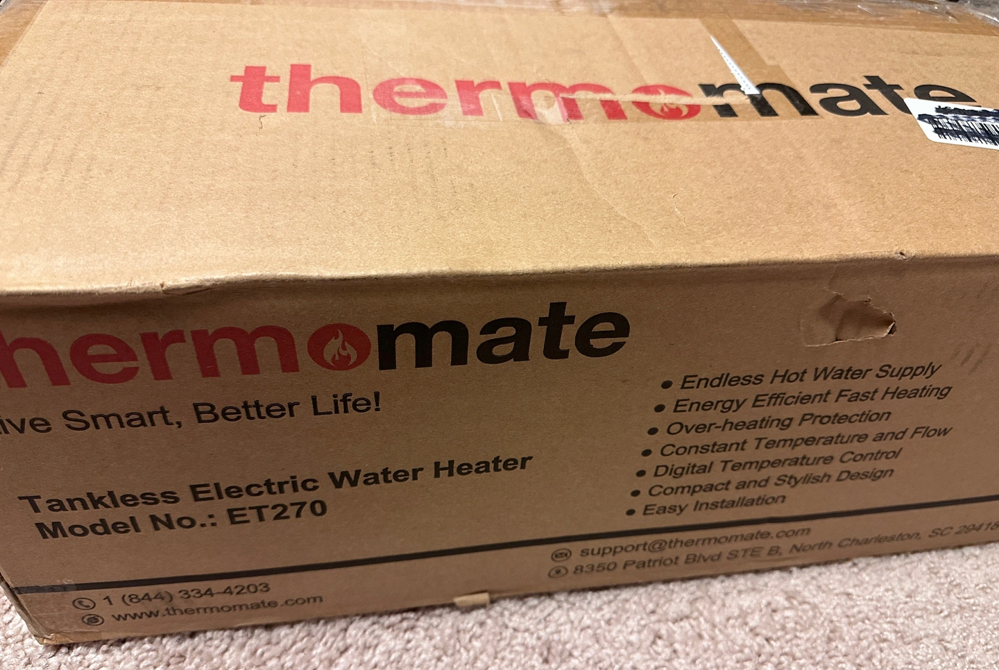 306Tankless Water Heater Electric 27kW 208~240 Volt, ThermoMate On Demand Instant Endless Hot Water Heater, Digital Temperature Display for Residential Whole House Shower NOTE: New in box, Model: ET270 [Instant Unlimited Hot Water] - On demand tankless electric water heater, providing hot water in 3 seconds when you need it and as long as you need, eliminating wait time, never run out of hot water again and No More cold shower. Flow Rate 5.27GPM @35°F Rise. Requires 120Amp breaker (3 Sets of Double-pole 40AMP Breakers) [Self-modulating Power] - Self-modulating technology regulating the amount of energy required to heat water only when you need it with 99.8% efficient, saving up to 60% on water heating cost comparing to traditional tank water heater. Wall mounted compact size with no water tank, convenient for any spaces, saving floor space and fitting into tight spaces. [Stable Water Temperature] - Auto adjusting energy consumption basing on income water temperature and flow, ensuring maximum efficiency, continuous stable temperature and optimal power usage. Digital temperature display allowing adjustment in 1° increment from 80°F to 140°F. Heating element separated from water tube significantly reducing scale, corrosion and mineral buildup on the element, achieving better performance and low maintenance. [Easy Installation & Safety Protection] - ETL certified with overheating protection, auto stop heating when detecting no water, quality workmanship for leakage protection NOTE - Make sure this water heater is the correct size for your hot water need: 27kW 208 ~ 240V (adjustable) draw max 114Amp; Required breaker: 3 x Double-POLE 40AMP; Wire gauge 3 x 8AWG; Unit size 17.12" x 13.12" x 3.12"; Water connection 3/4" NPT