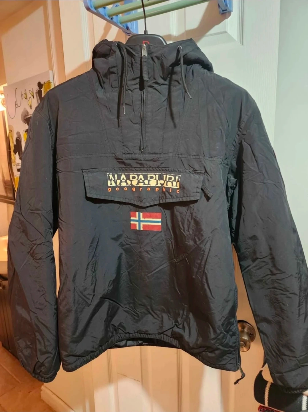Snuggle up in style with this black Napapijri hooded jacket, perfect for those in-between weather days. It's in very good condition, ready for its next adventure!