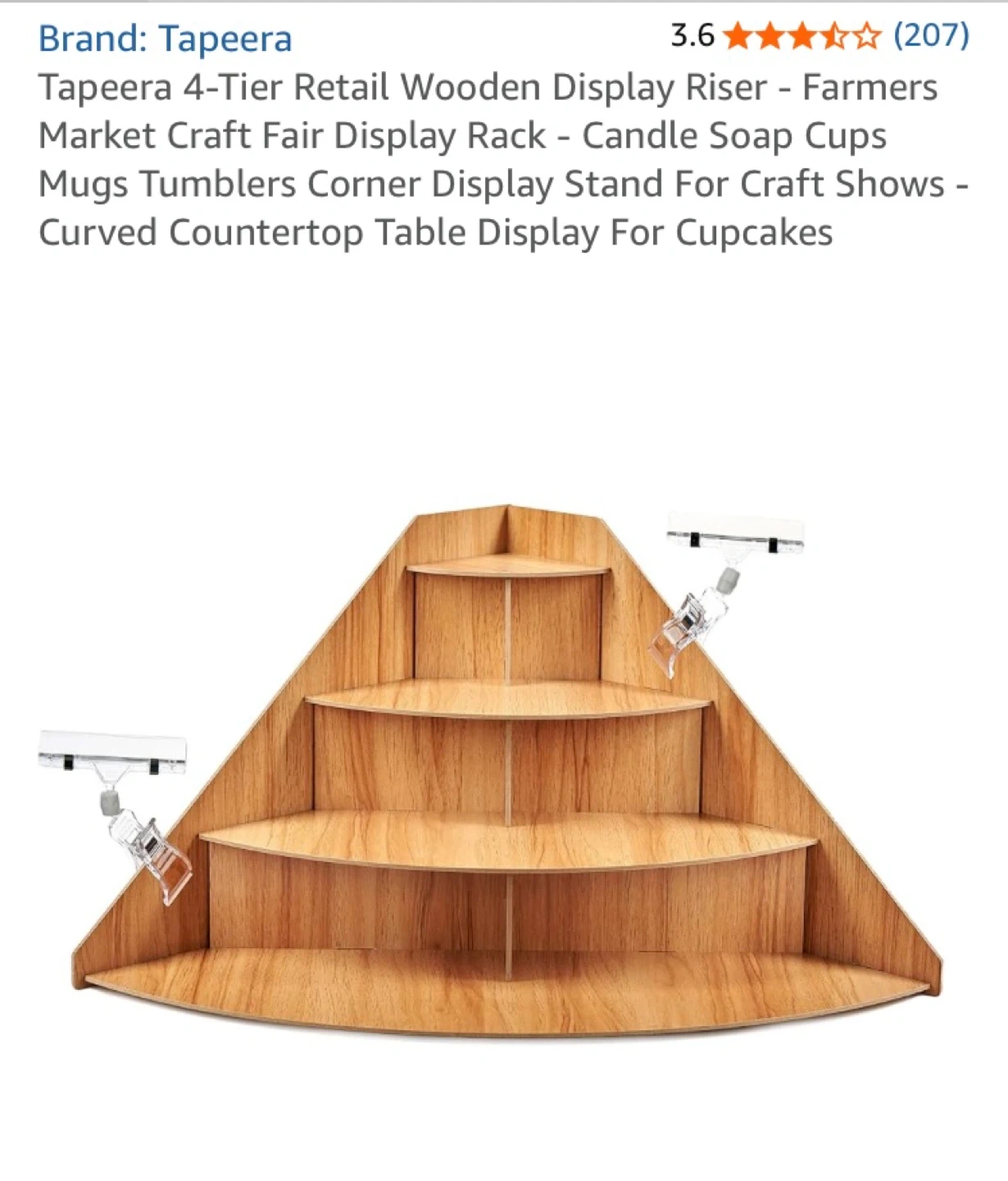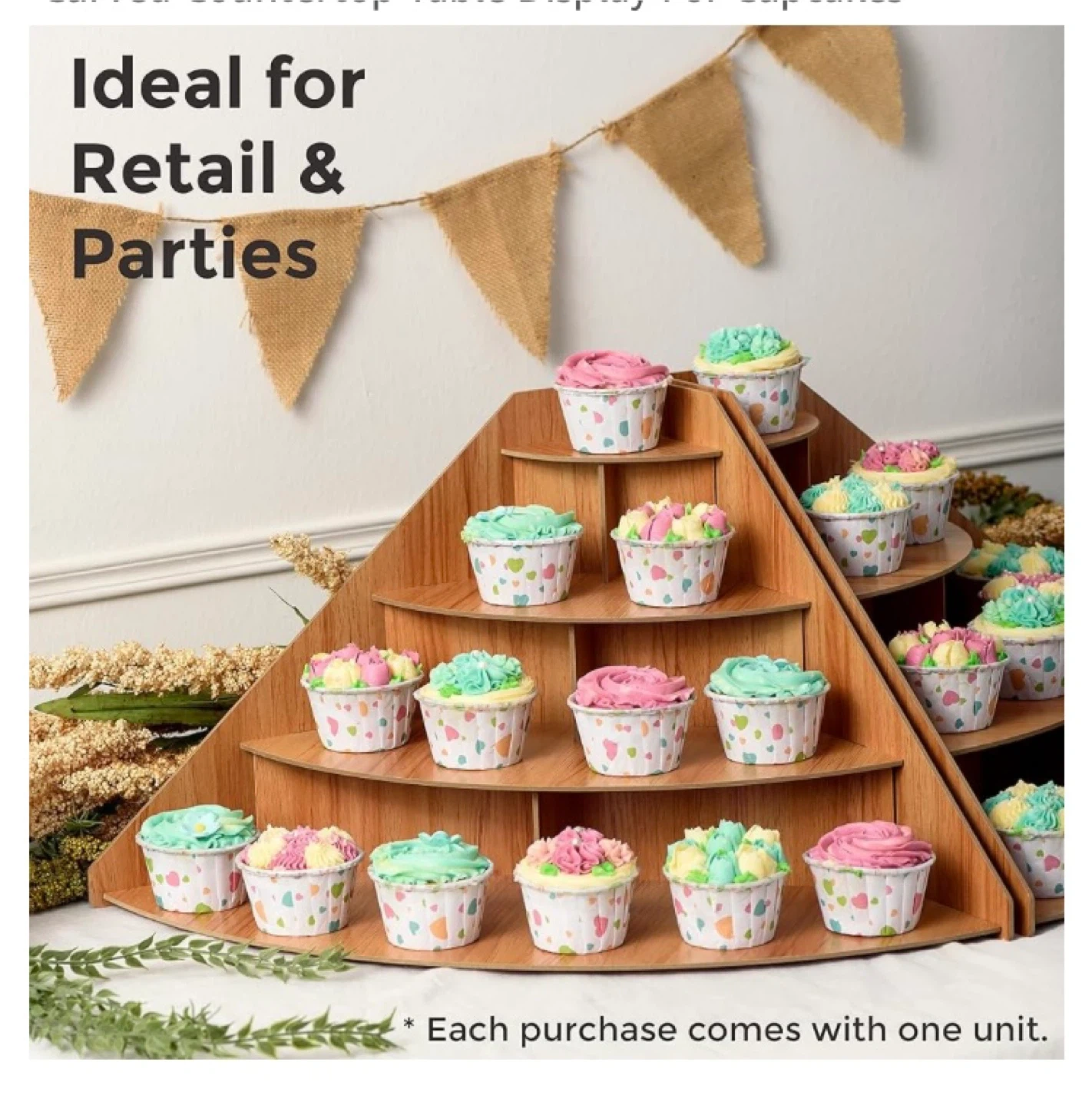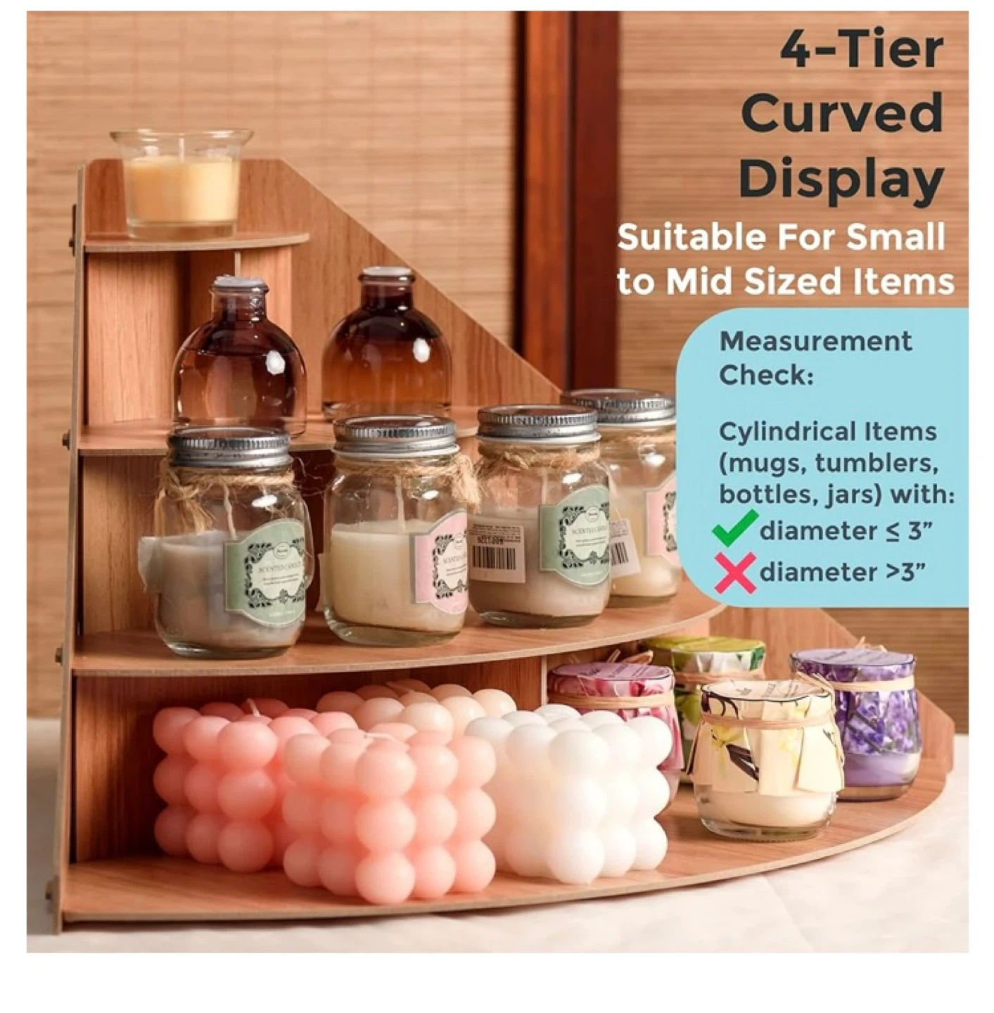 This Tapeera 4-tier wooden display riser is perfect for showcasing small to mid-sized items. It's ideal for retail displays, craft fairs, or even organizing your space at home. The curved design adds a touch of elegance, and it's suitable for items with a diameter of 3" or less. Multiple configuration options are available with 4 curved stands and 2 straight stands. Assembly is required Brand New Cash only