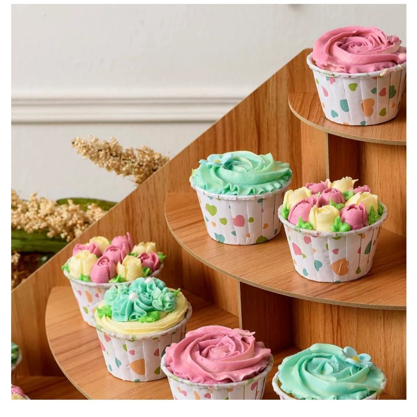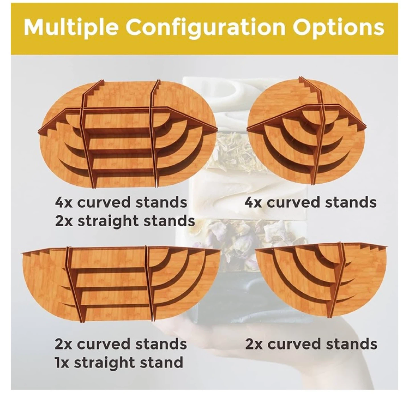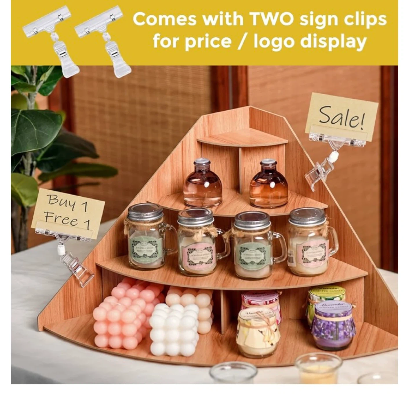 This Tapeera 4-tier wooden display riser is perfect for showcasing small to mid-sized items. It's ideal for retail displays, craft fairs, or even organizing your space at home. The curved design adds a touch of elegance, and it's suitable for items with a diameter of 3" or less. Multiple configuration options are available with 4 curved stands and 2 straight stands. Assembly is required Brand New Cash only