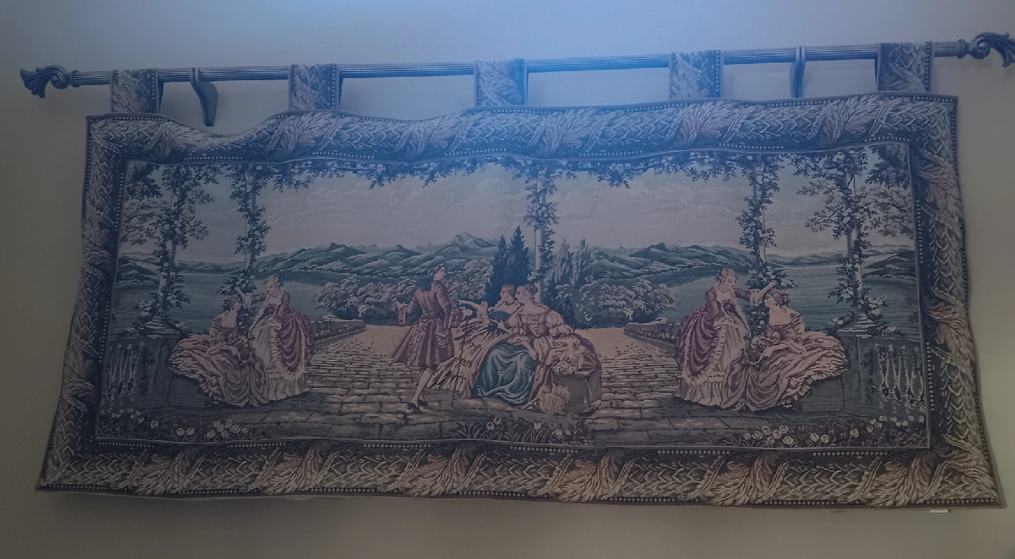 10This is a beautiful tapestry wall hanging. It features a scene with people in a garden setting. It's a unique and great way to add some art to your home! Pole included.