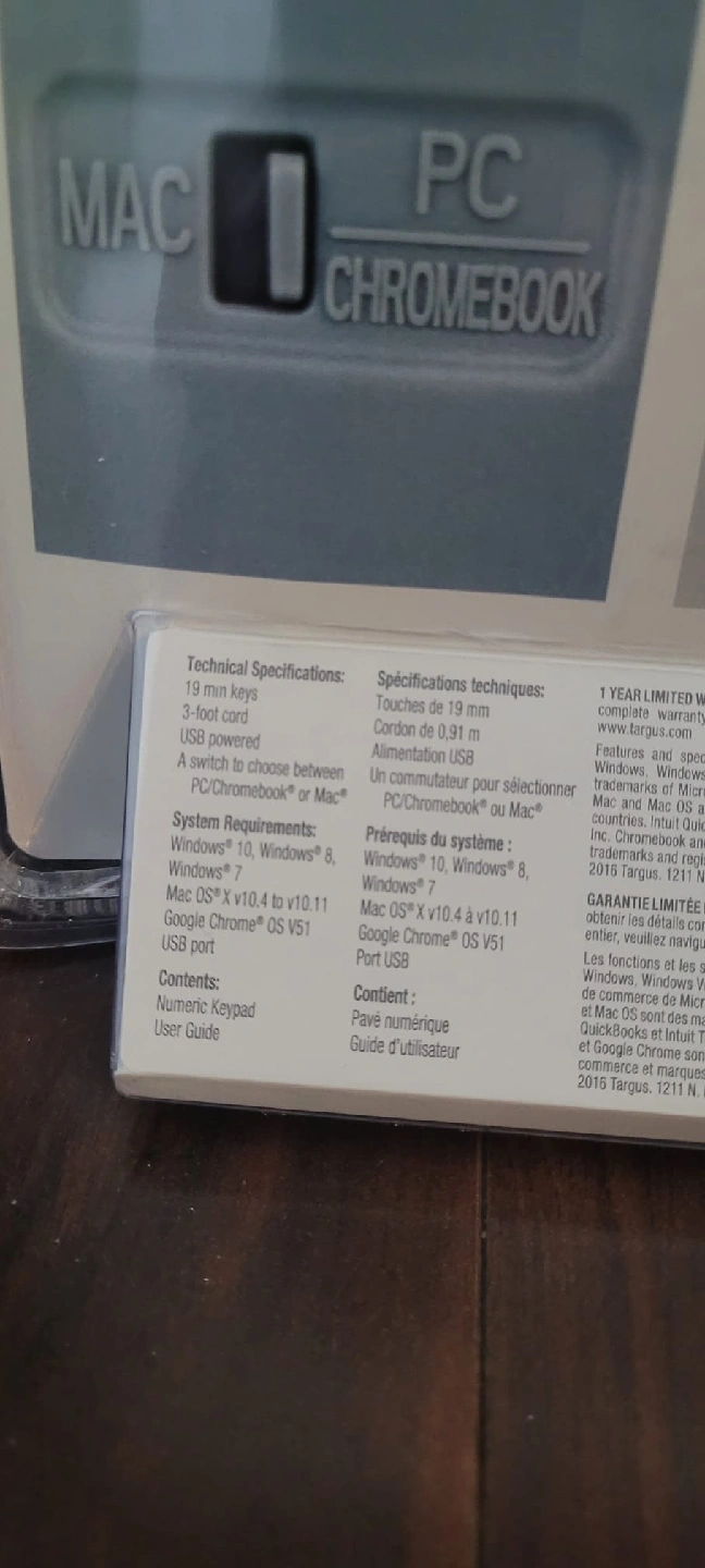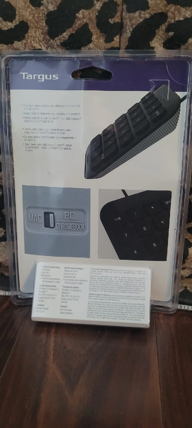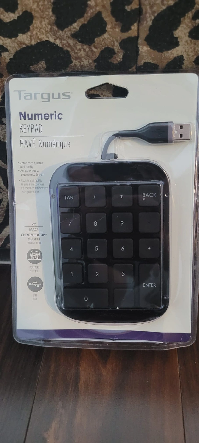 102Selling a brand new Targus Numeric Keypad, still in its original packaging! It features full-size, concave keys designed for comfort and accuracy. It works with Mac, PC, and Chromebook. Key specs: - 19 mm keys - 3-foot cord - USB powered - Includes the numeric keypad and user guide