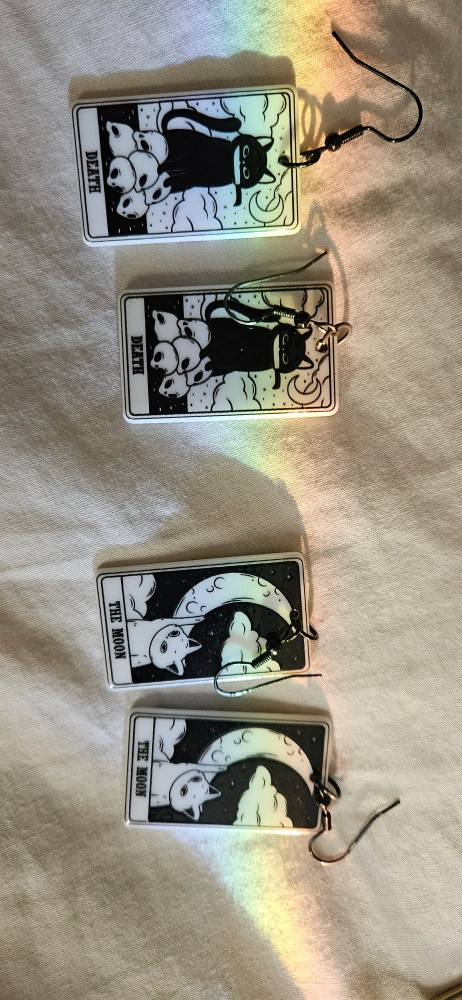 Cute tarot card earrings featuring cats! Two pairs included: one with the Death card design and another with the Moon card design