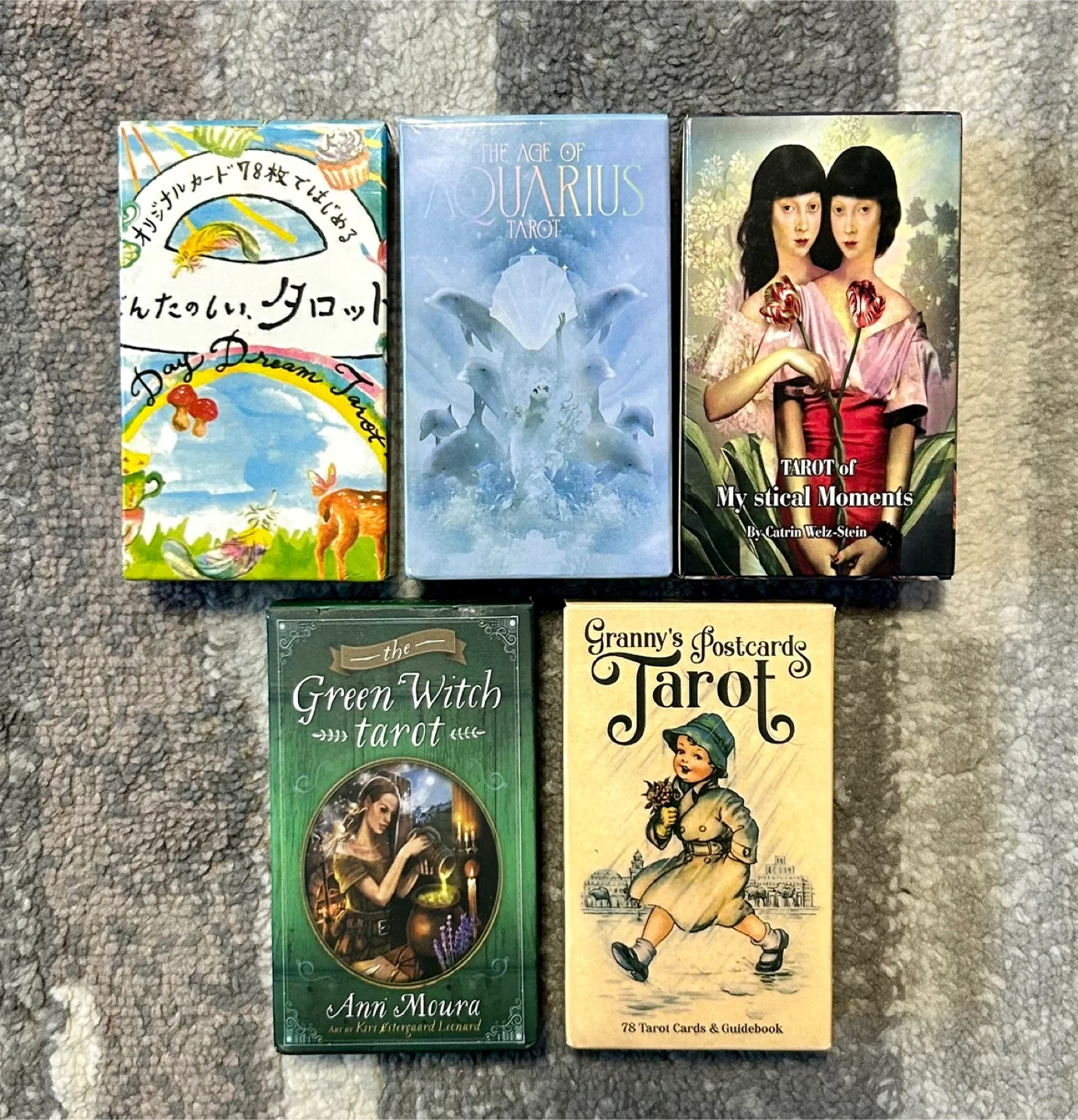 10Unused decks. $7 each - Day Dream Tarot - The Age of Aquarius Tarot - Tarot of Mystical Moments by Catrin Welz-Stein - The Green Witch Tarot by Ann Moura - Granny's Postcards Tarot