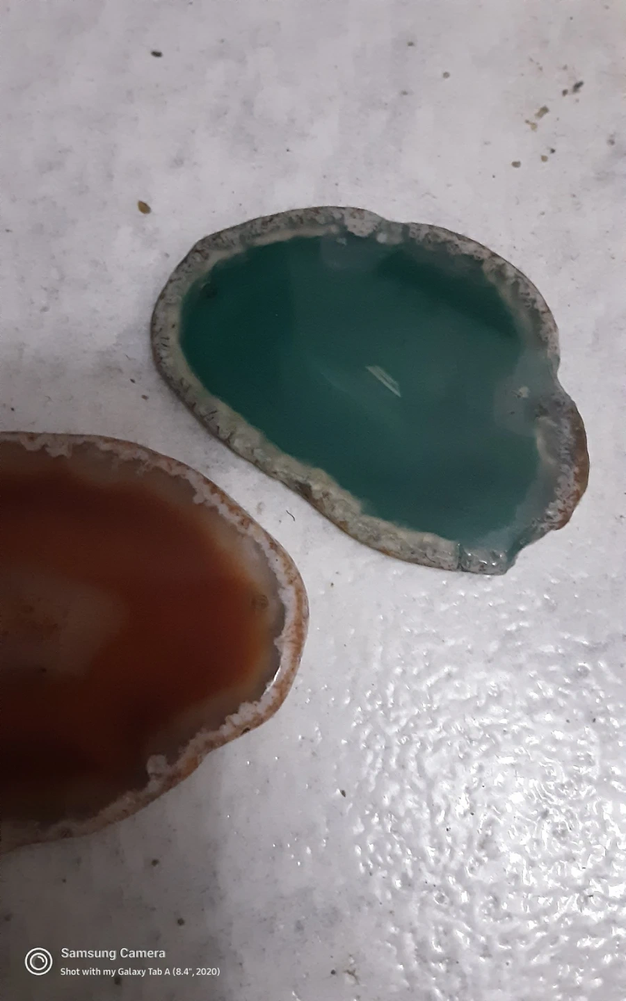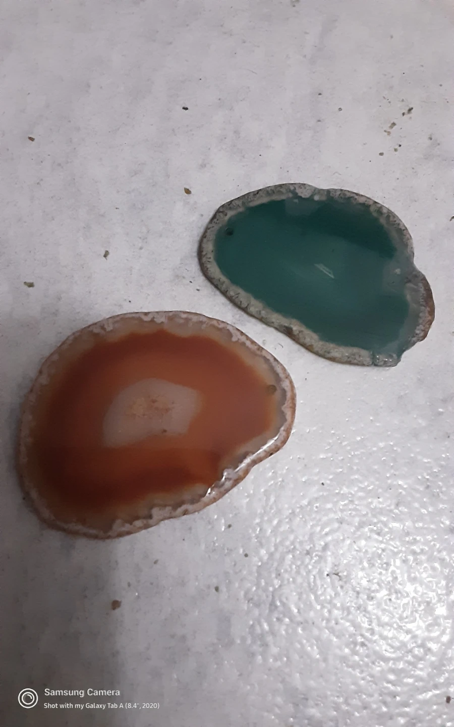 These are two natural agate slices. One slice is a rich orange-brown, and the other is a vibrant teal. They have a polished surface and a rough, natural edge. They're perfect for coasters or decorative display.