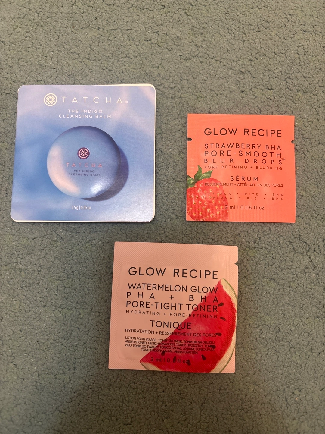 184Sample sizes of Tatcha Indigo Cleansing Balm and Glow Recipe Strawberry BHA PORE-SMOOTH Blur Drops serum and Watermelon Glow PHA+BHA Pore-Tight Toner. Perfect for travel or trying before committing to full size.