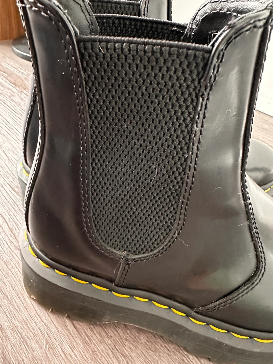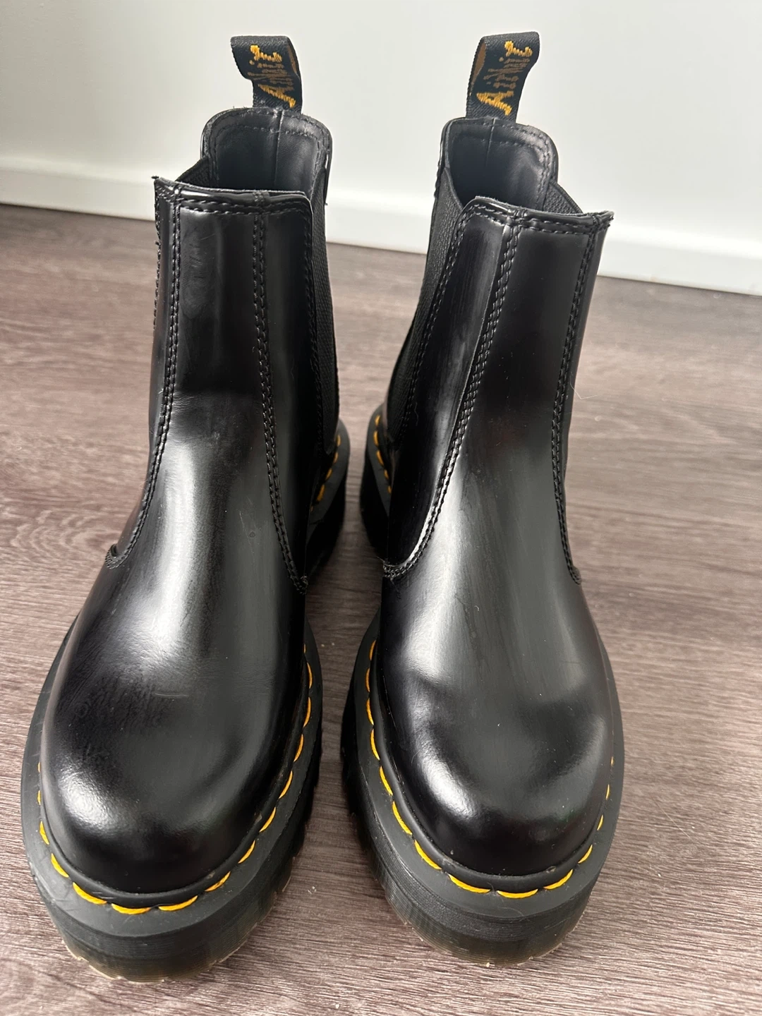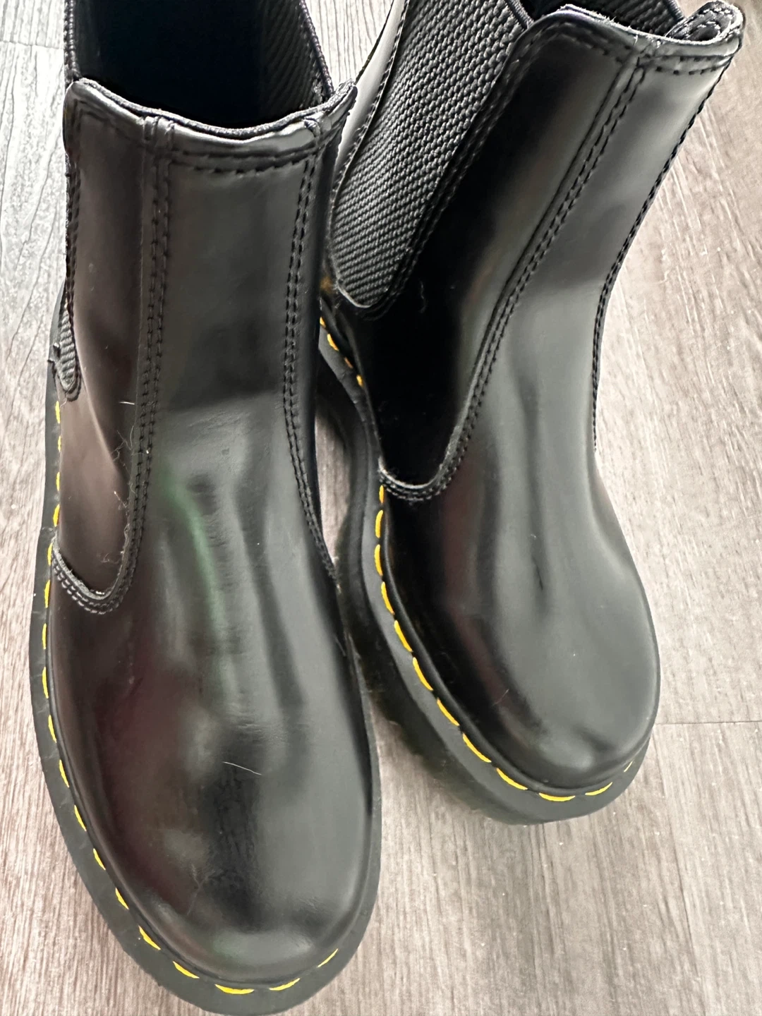 These are black leather Dr. Martens platform Chelsea boots. They're a US L size 6.Built with a durable platform sole and signature yellow stitching. These boots are ready for everyday wear!