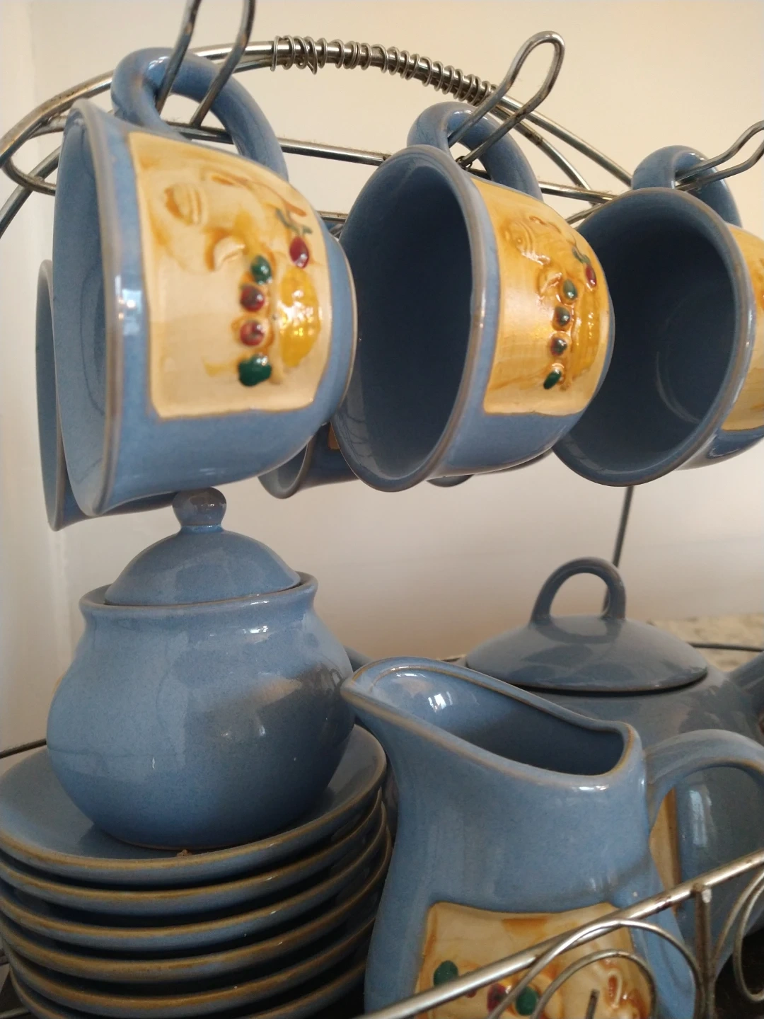 This charming tea set includes a teapot, sugar bowl, creamer, four cups, and saucers. It's made of durable ceramic with a lovely blue glaze and decorative floral accents. Perfect for serving tea during a casual gathering!