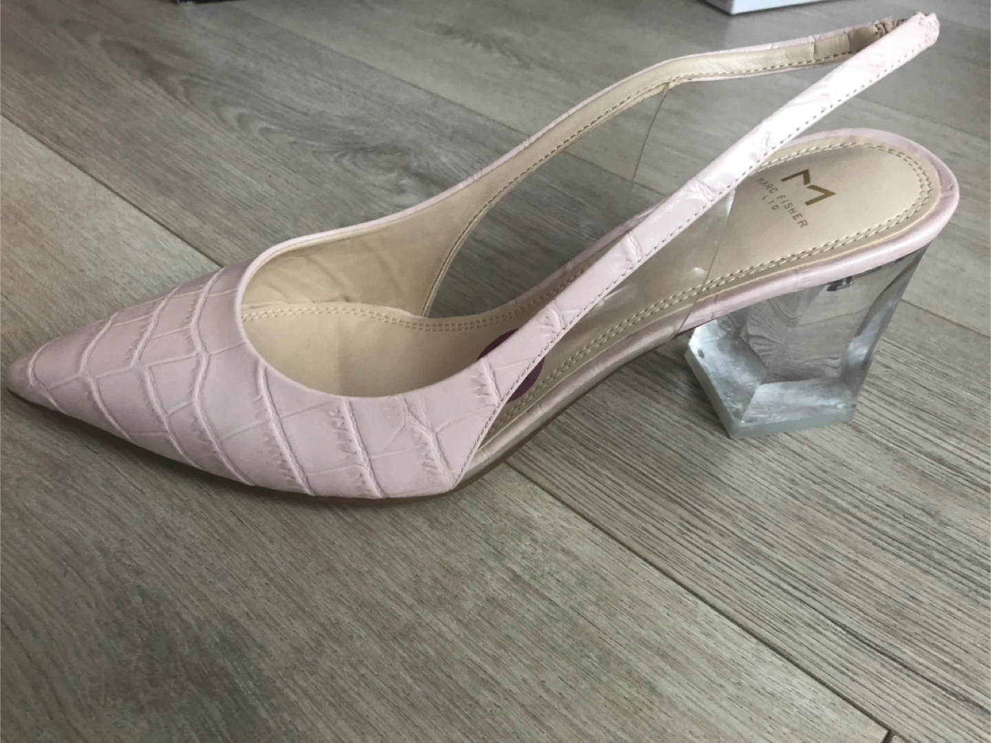 These Marc Fisher LTD slingback heels feature a pastel pink, croc-embossed finish. They have clear lucite block heels and matching clear slingback straps. Perfect for dressing up any outfit! best offer