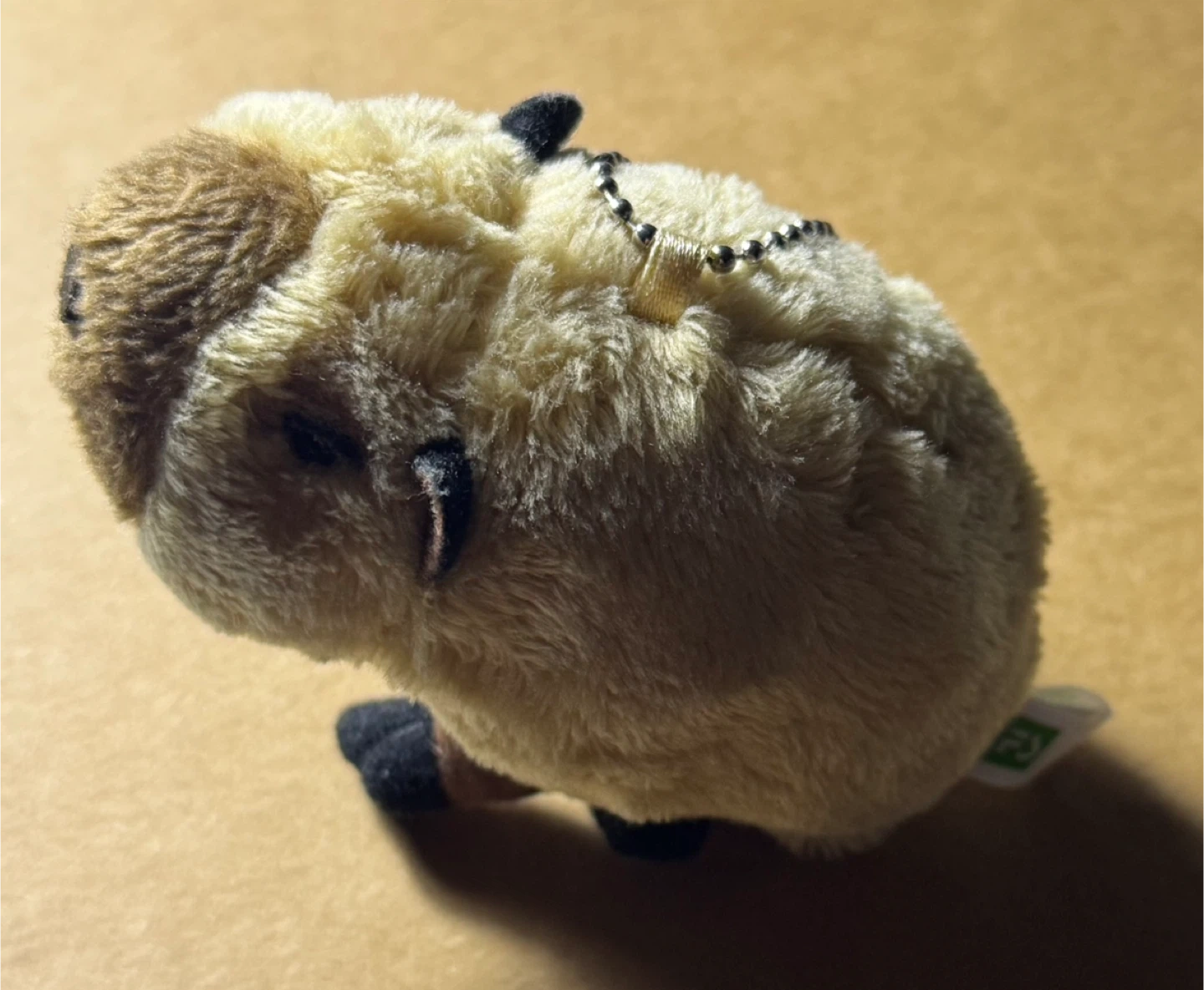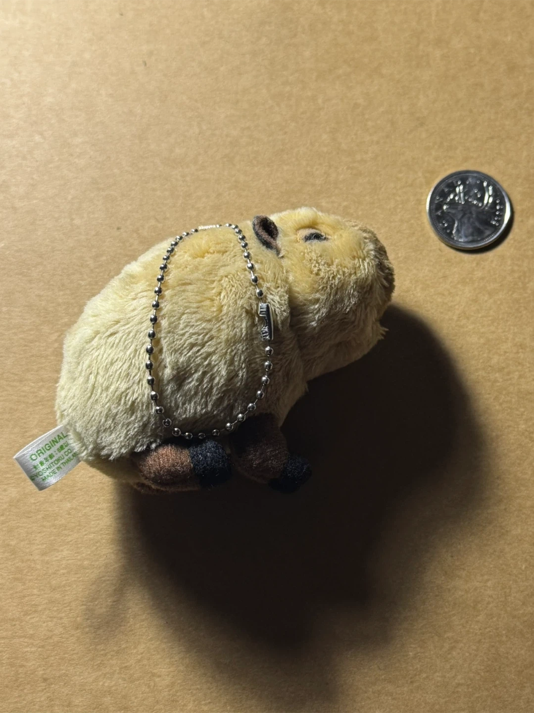 A fluffy capybara plush with a silver bead keychain. It's made of soft material. Perfect for attaching to your backpack or keys!