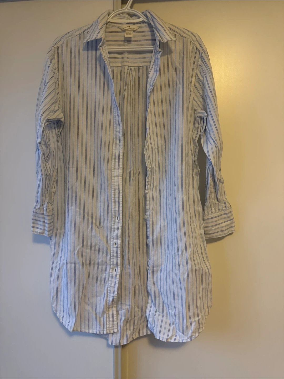 Here's a cute striped button-up shirt from H&M! It's perfect for layering or wearing on its own. It's in great condition and ready for a new wardrobe