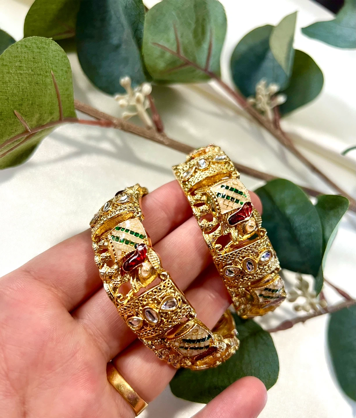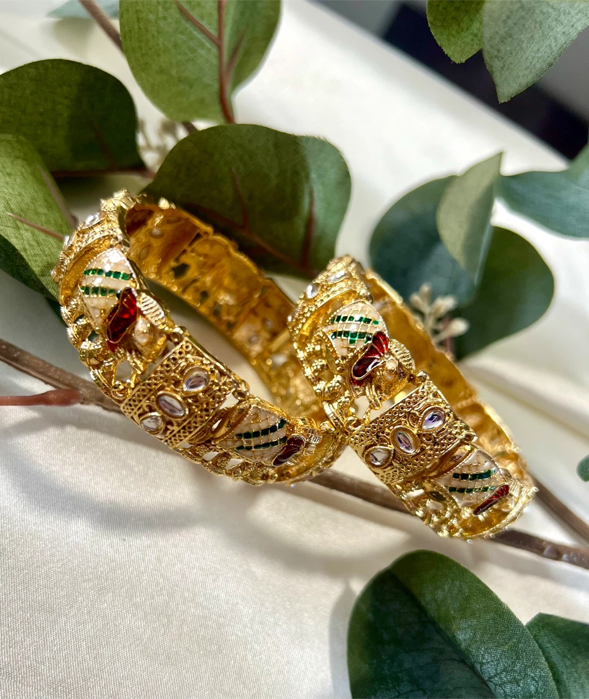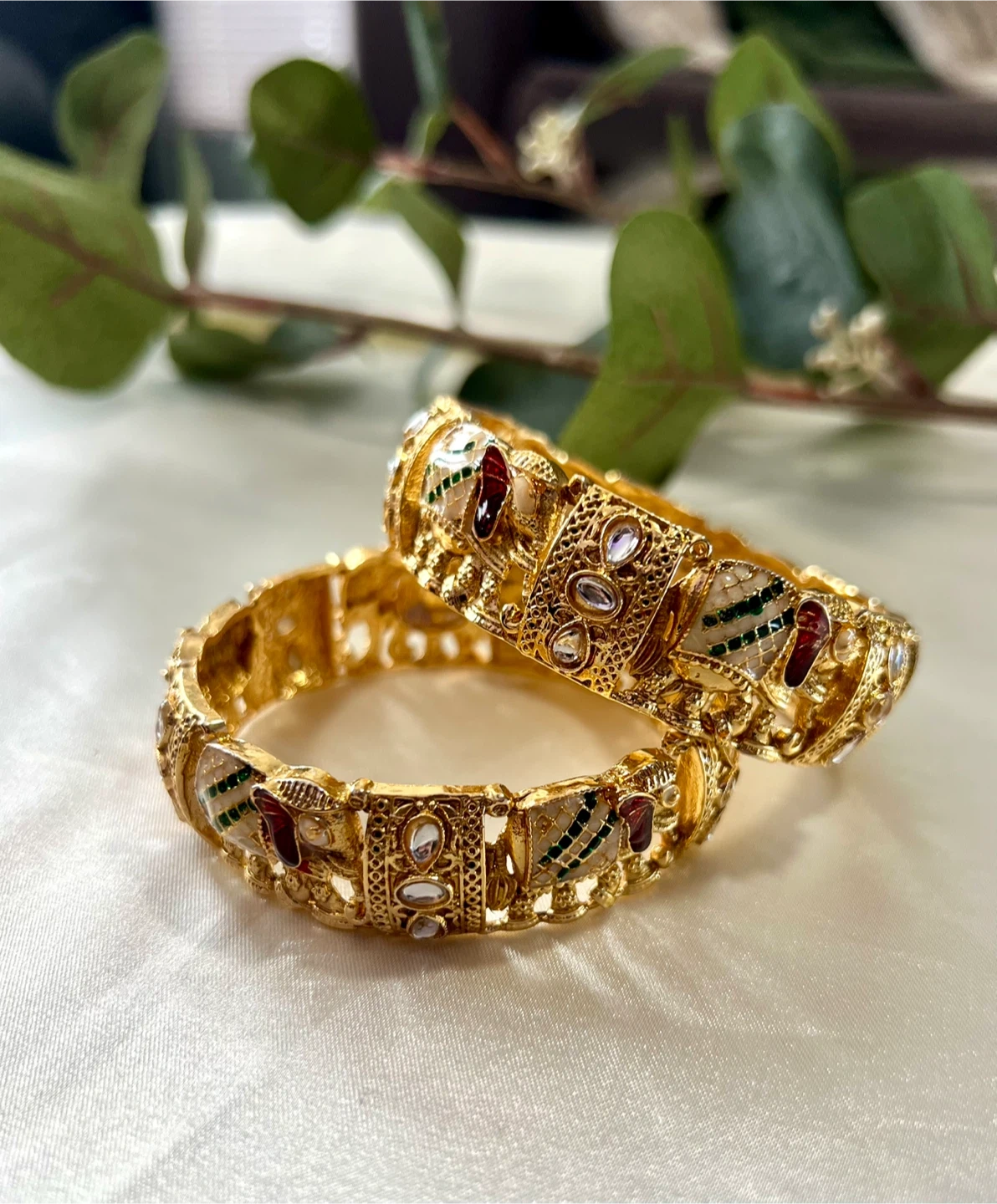 A pair of ornate gold-tone bangles, intricately designed with colourful enamel work and small clear stones. These are perfect for adding a touch of elegance to traditional or festive outfits.