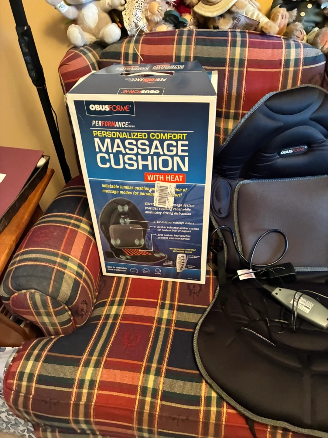 This Obusforme massage cushion offers personalized comfort with multiple massage modes and heat. It features a vibrating massage system for neck and back relief, six compact massage motors for custom support, and LED indicators. Includes remote for easy control and welcoming warmth.