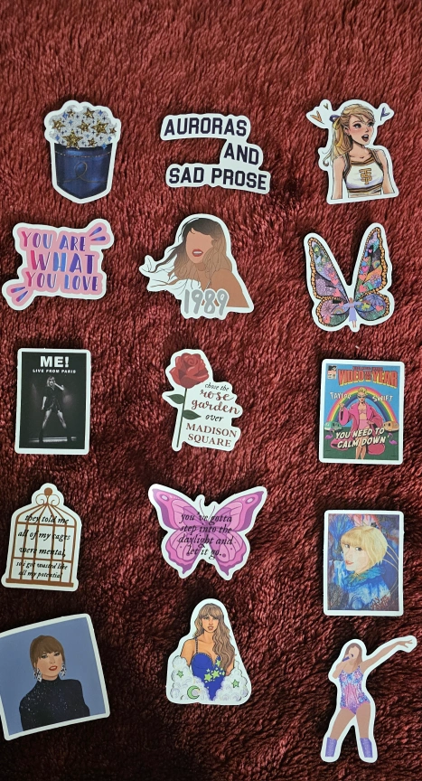 A collection of Taylor Swift themed stickers! These are perfect for decorating laptops, water bottles, or notebooks. Featuring designs inspired by her songs and albums like 1989, ME!, and You Need to Calm Down