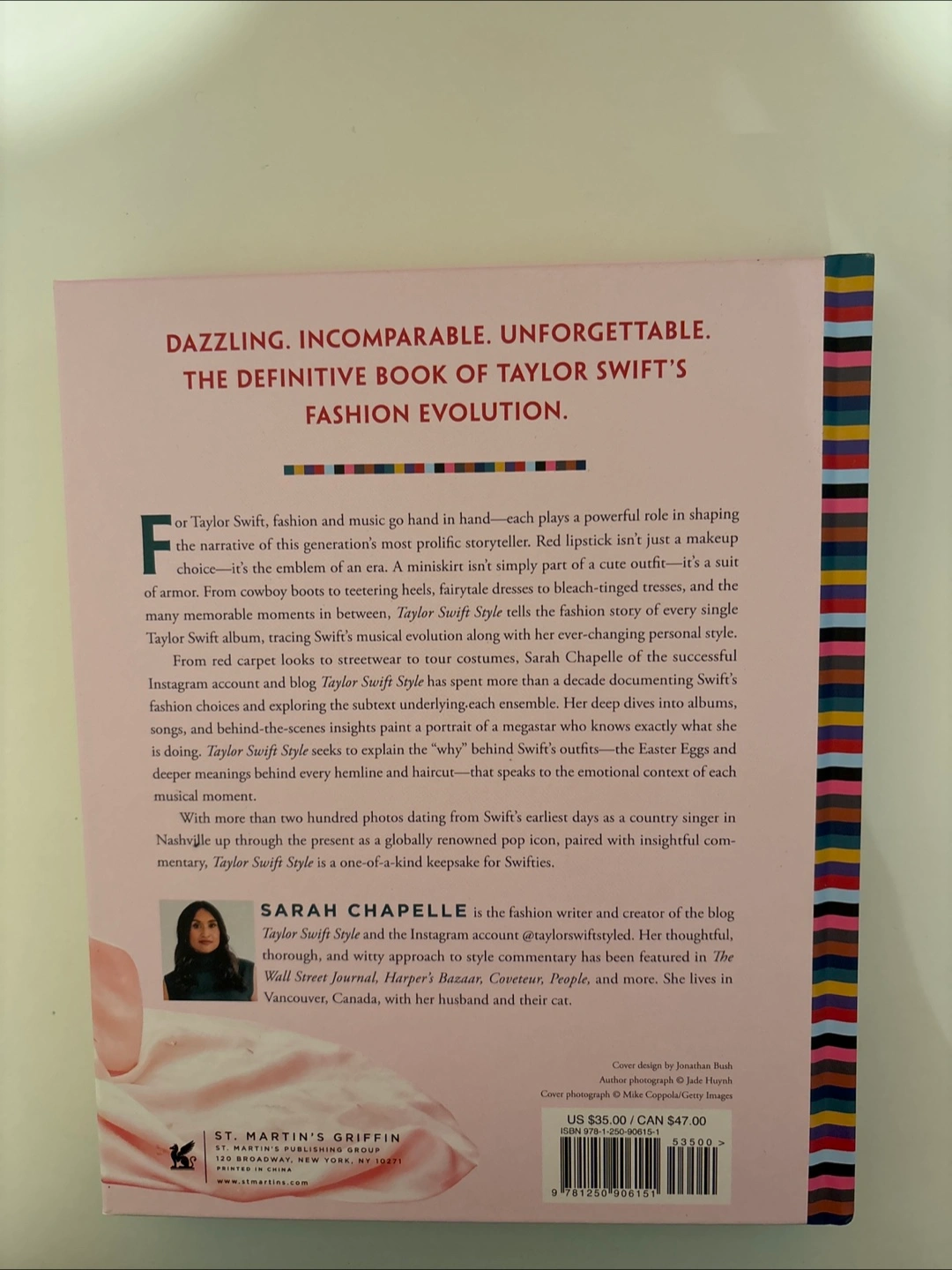 Hardback coffee table book. Explores Taylor Swift's fashion evolution. Features hundreds of photos. Written by Sarah Chapelle. Published by St. Martin's Griffin.