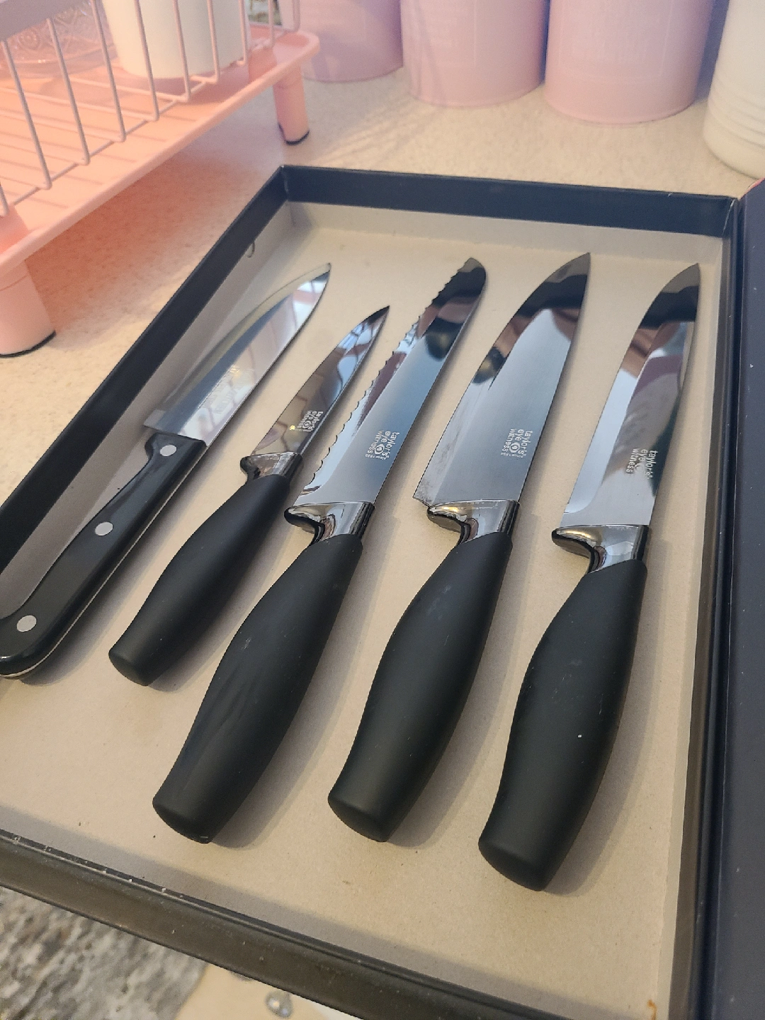 Taylor's Eye Witness knife set! Includes a variety of knives for different purposes, all in great condition and ready to use. Comes in the original box. These knives are titanium. One is missing I put a stainless steel in its place. Also no sharpener as shown on the box. So 4 titanium knives one stainless steel only.