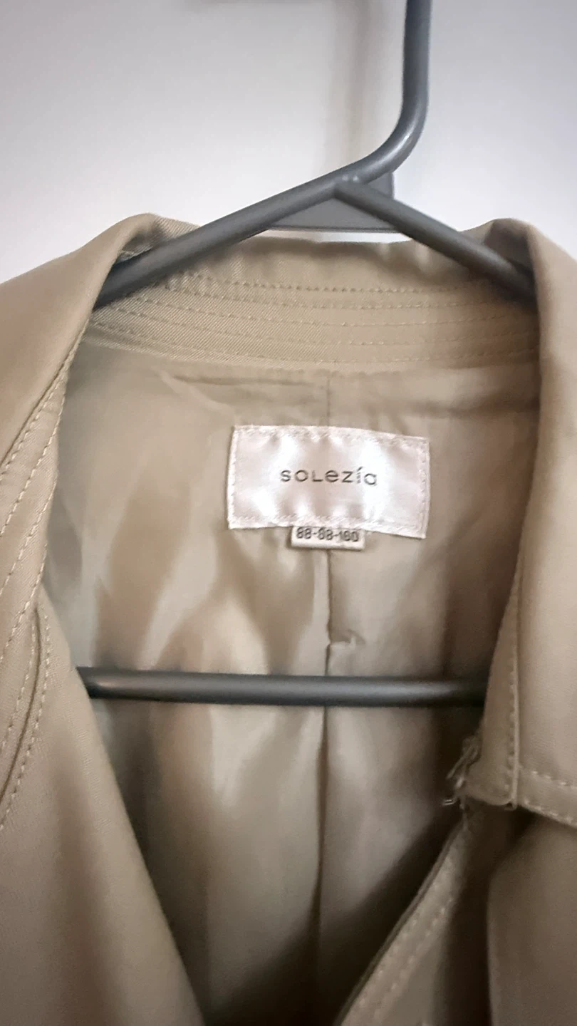 This is a classic beige trench coat from Solezia. It's a double-breasted style with button closures. The lining is a silky beige material.