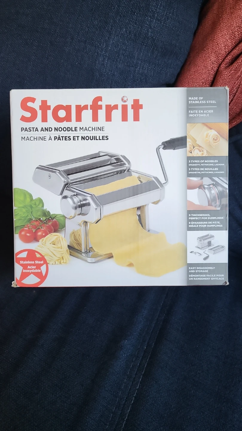 This Starfrit pasta and noodle machine is made of stainless steel. It makes 3 types of noodles: spaghetti, fettuccine, and lasagna. It also offers 9 thicknesses, perfect for dumplings! The machine is easy to disassemble and store.