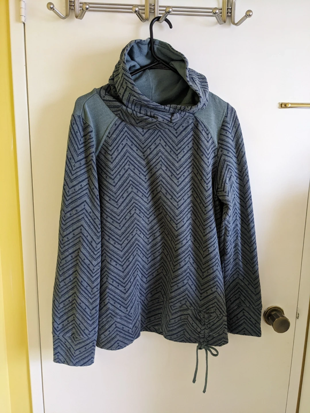 This Prana sweater features a cozy cowl neck and a stylish chevron pattern. It's a size large and lightweight. The drawcord at the hem allows for an adjustable fit.