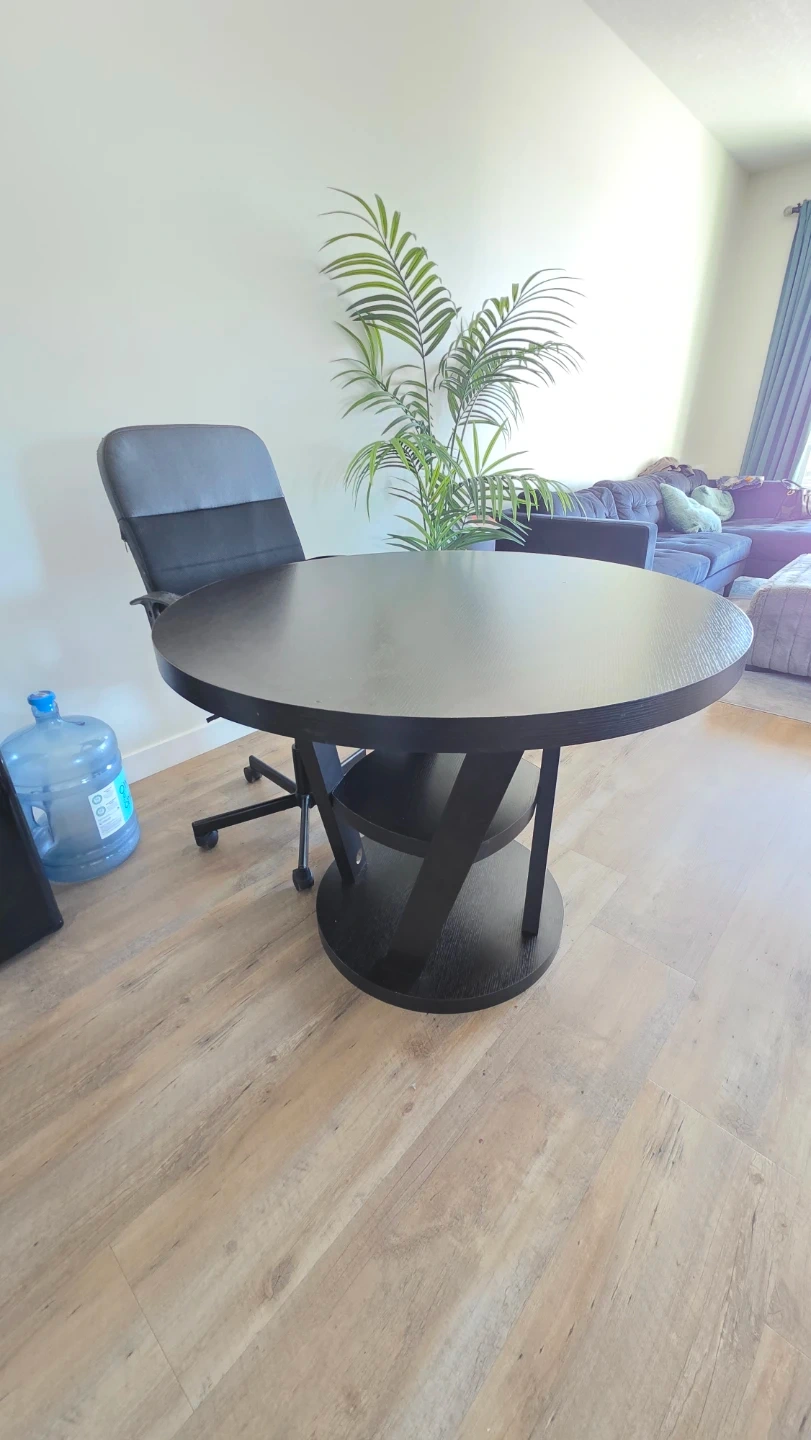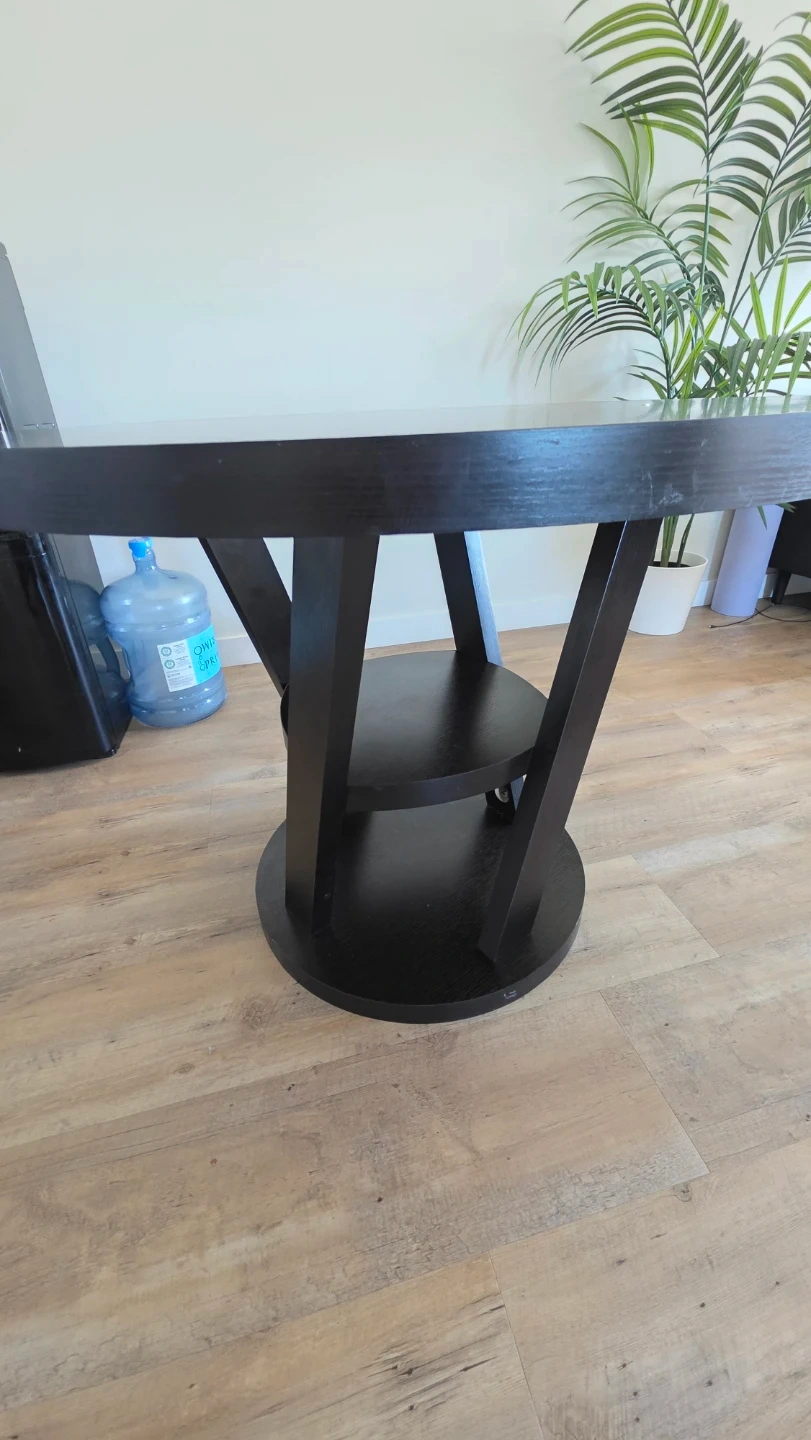 A dark wood round dining table with a unique pedestal base. It's got a modern design that fits well in most spaces. Perfect for a breakfast nook or a smaller dining area. The table is sturdy and ready for a new home!