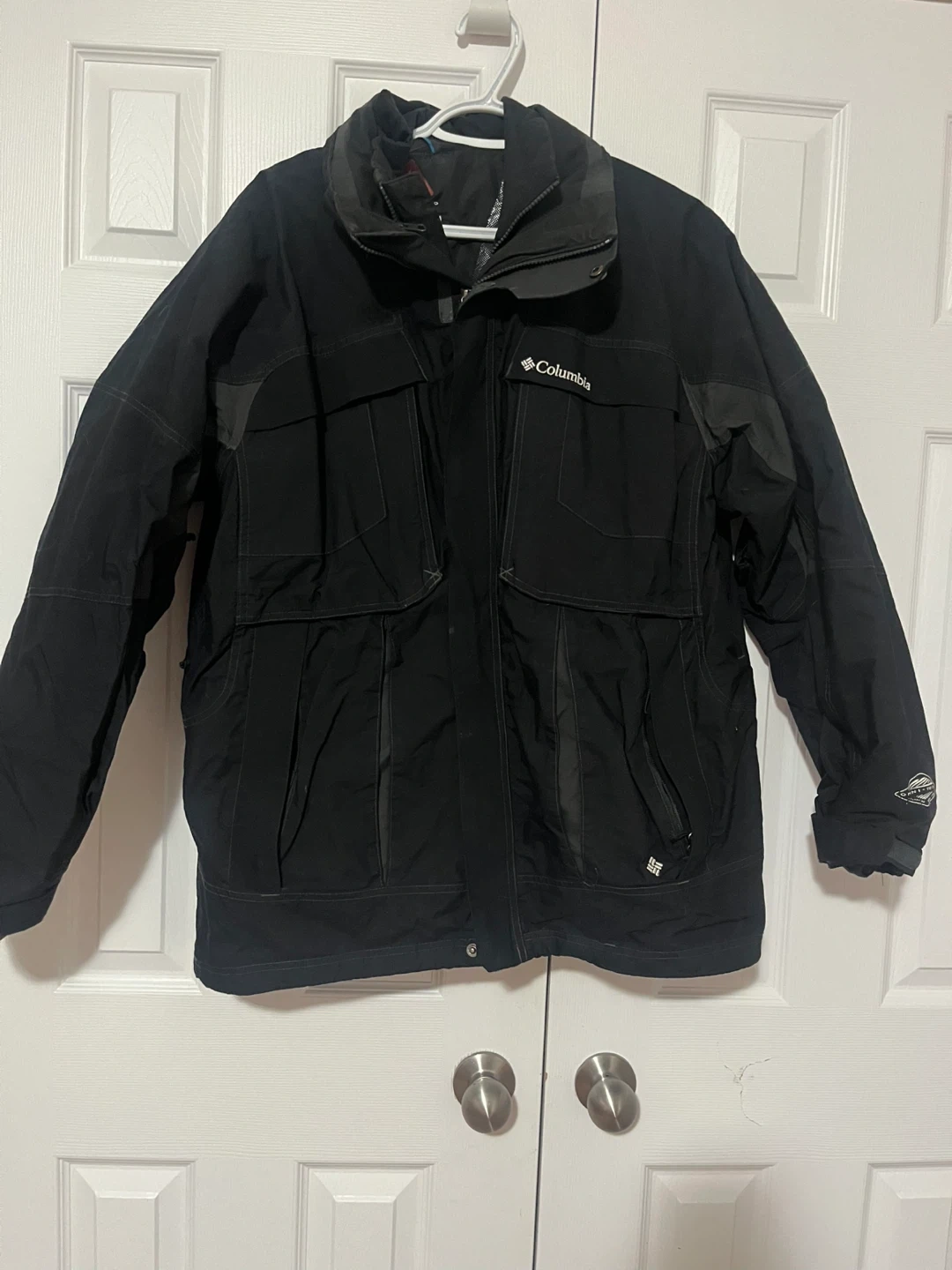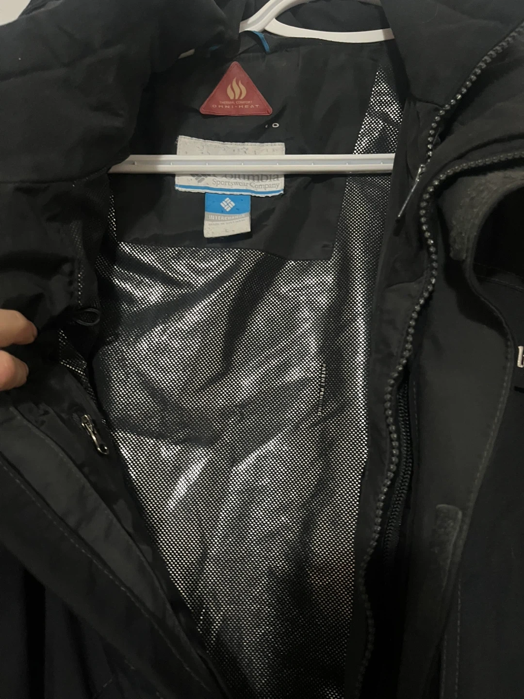This is a black Columbia jacket with Omni-Heat technology. It's designed for warmth and has multiple pockets for convenience. Great for colder weather!