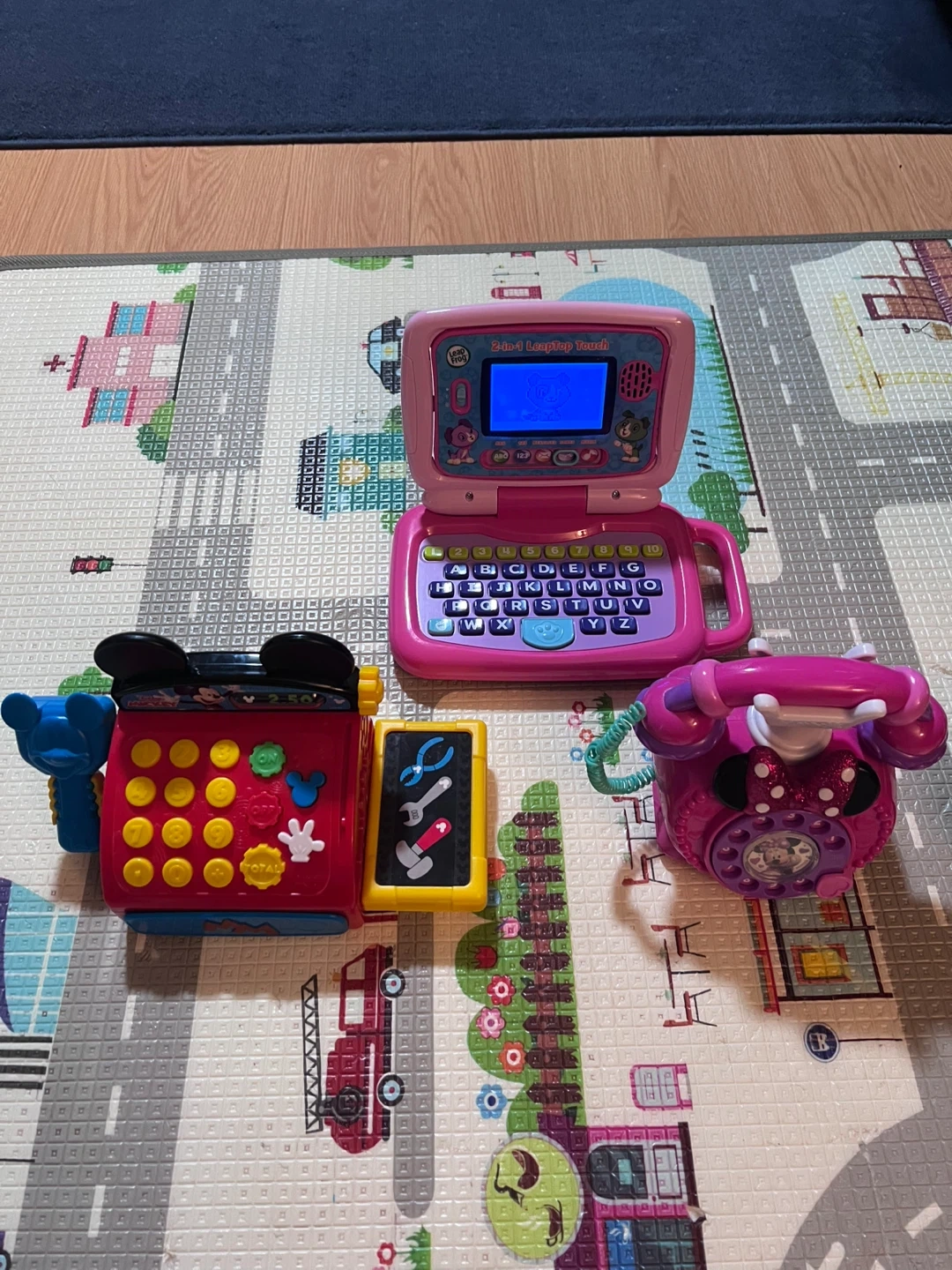 This lot includes a pink LeapFrog mini laptop and a pink Minnie Mouse toy phone. There's also a red Mickey Mouse themed activity toy with tools. These toys are great for early learning and imaginative play! They're all colourful and engaging for young children.