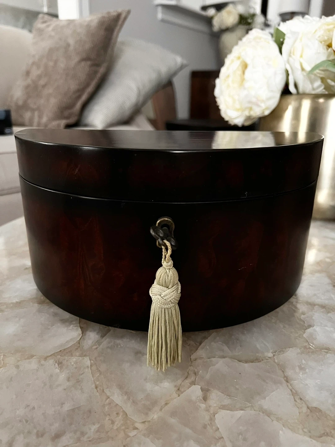 This is a lovely wooden decorative jewelry box. It's finished in a rich, dark wood stain and features a brass lock with a decorative tassel. The interior is lined with black velvet. Perfect for storing small treasures or as an accent piece!