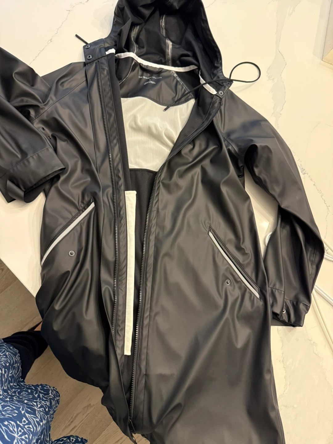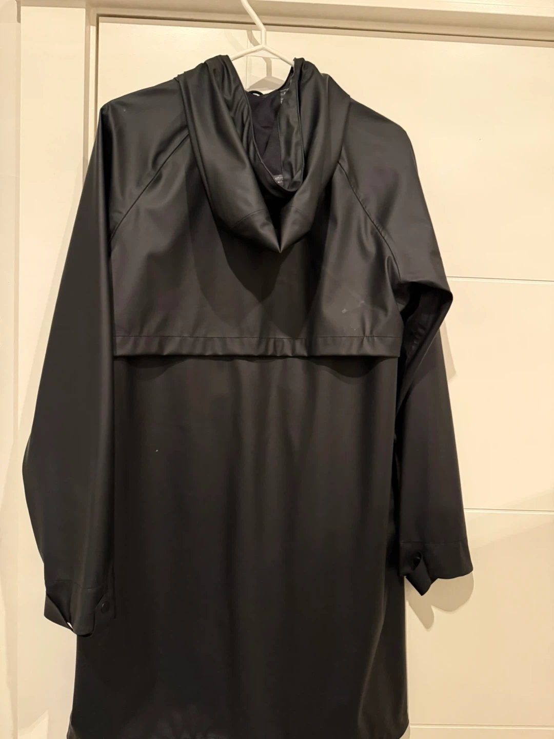 Selling a black raincoat from The Group A Baton. It's a size small and has a hood. Perfect for rainy days!