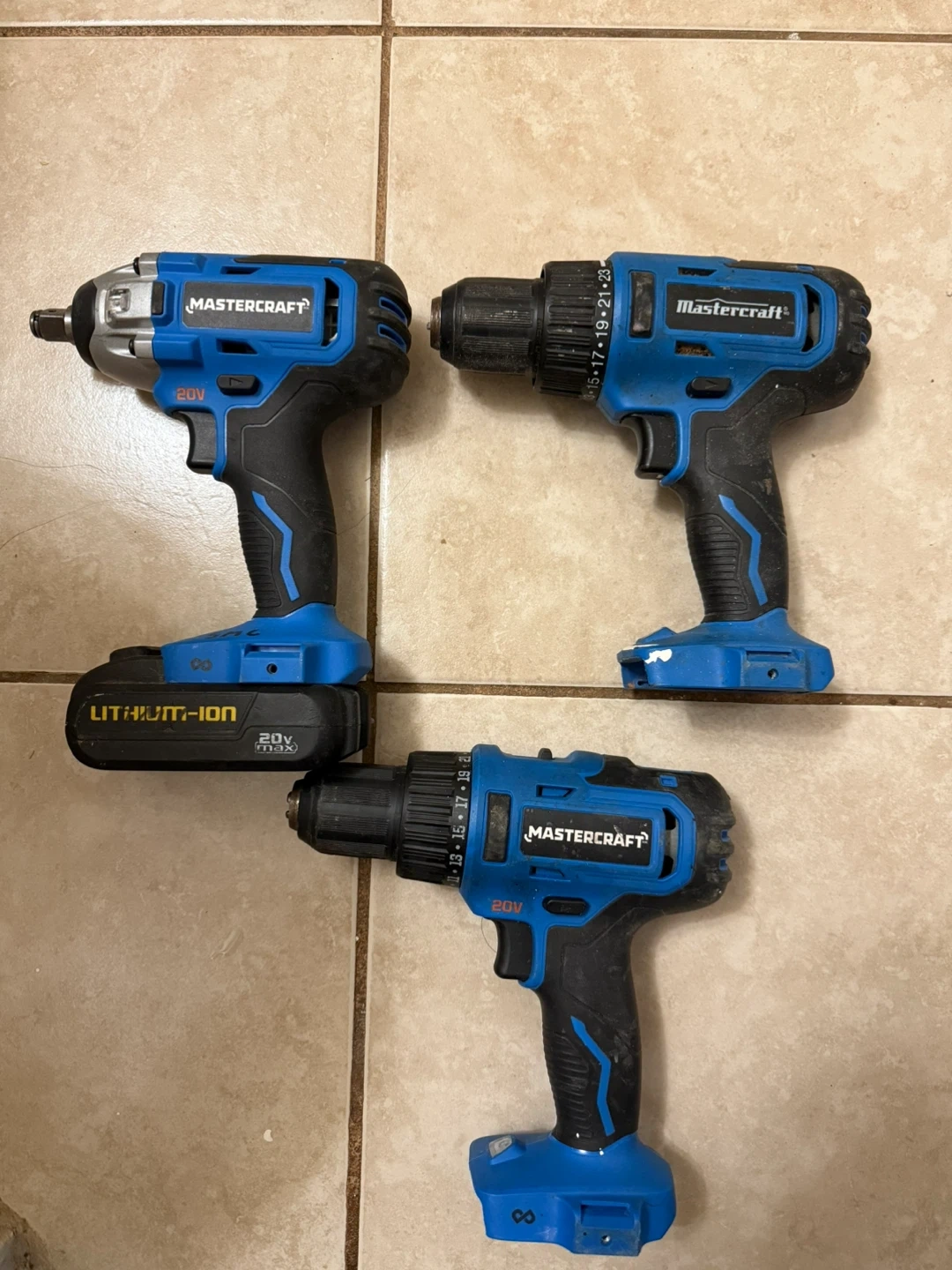 Set includes one Mastercraft 20V cordless impact wrench and two 20V cordless drills. All tools are blue and black. Lithium-ion batteries are included.