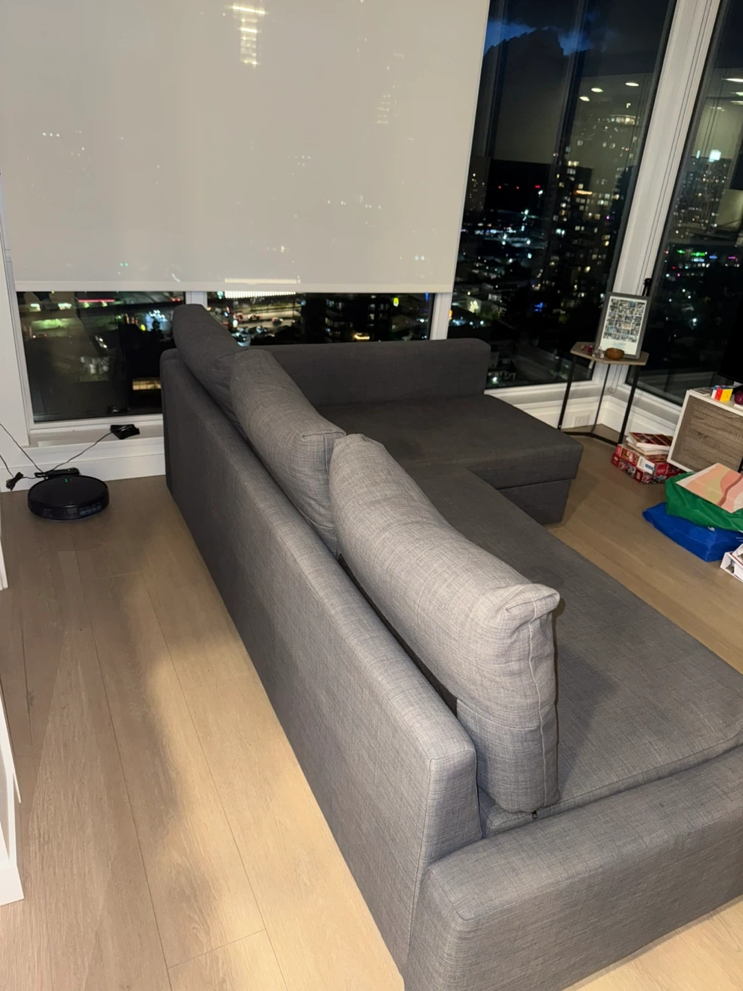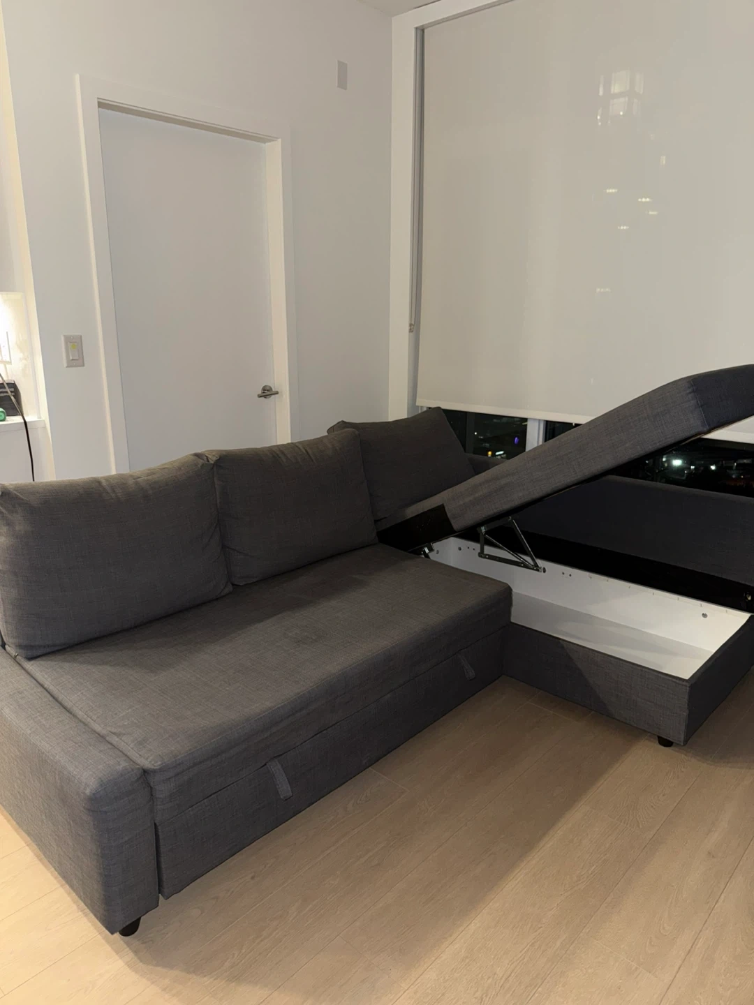Grey sectional sofa. Features built-in storage beneath the chaise and seats. Upholstered in a durable fabric.
