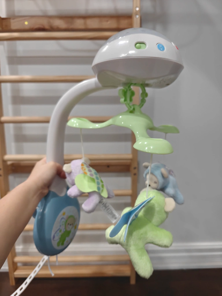 This Fisher-Price baby mobile comes with three plush toys: a monkey, a turtle, and a bear. It also includes a separate portable sound machine with a light. Great for soothing a baby to sleep.