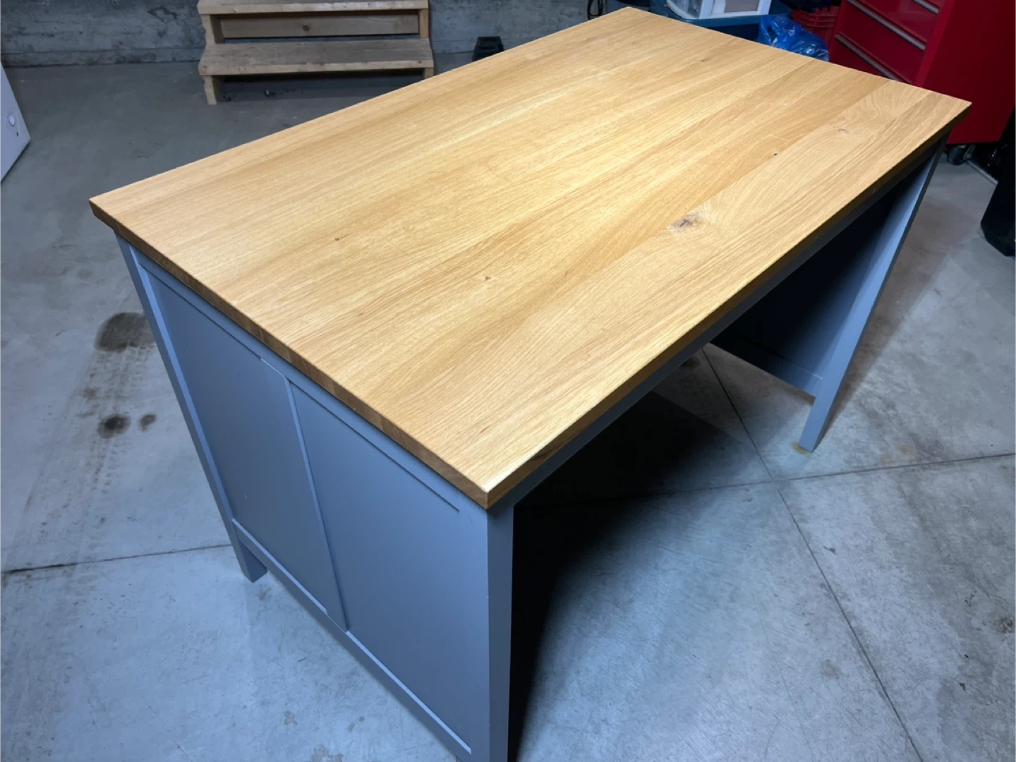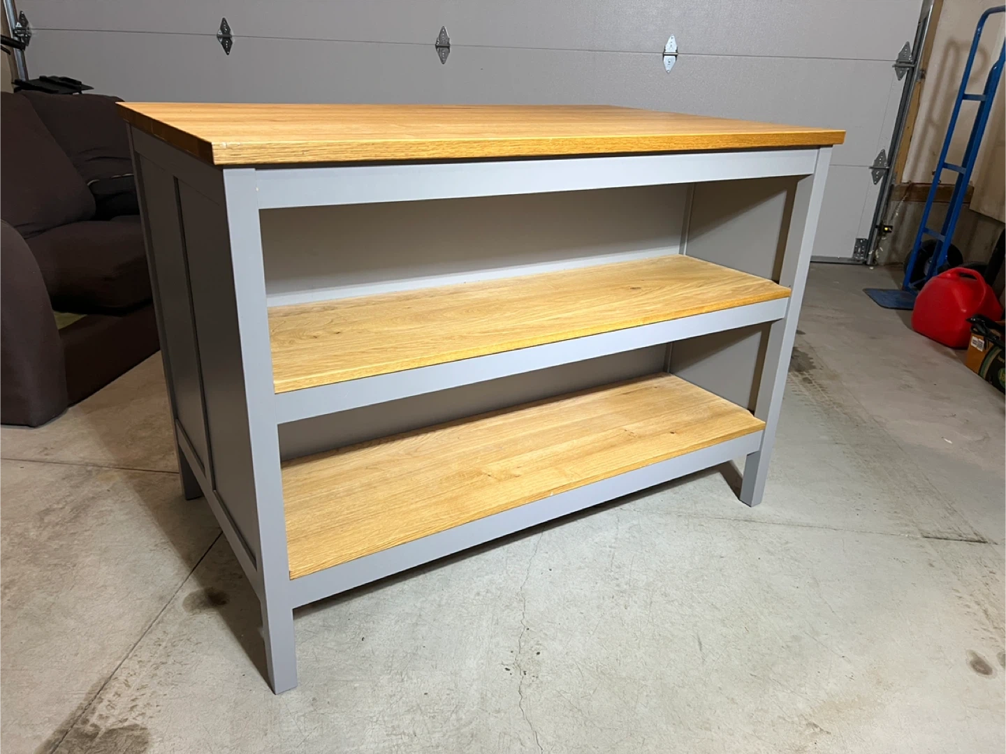 Wooden top island with grey base and shelves