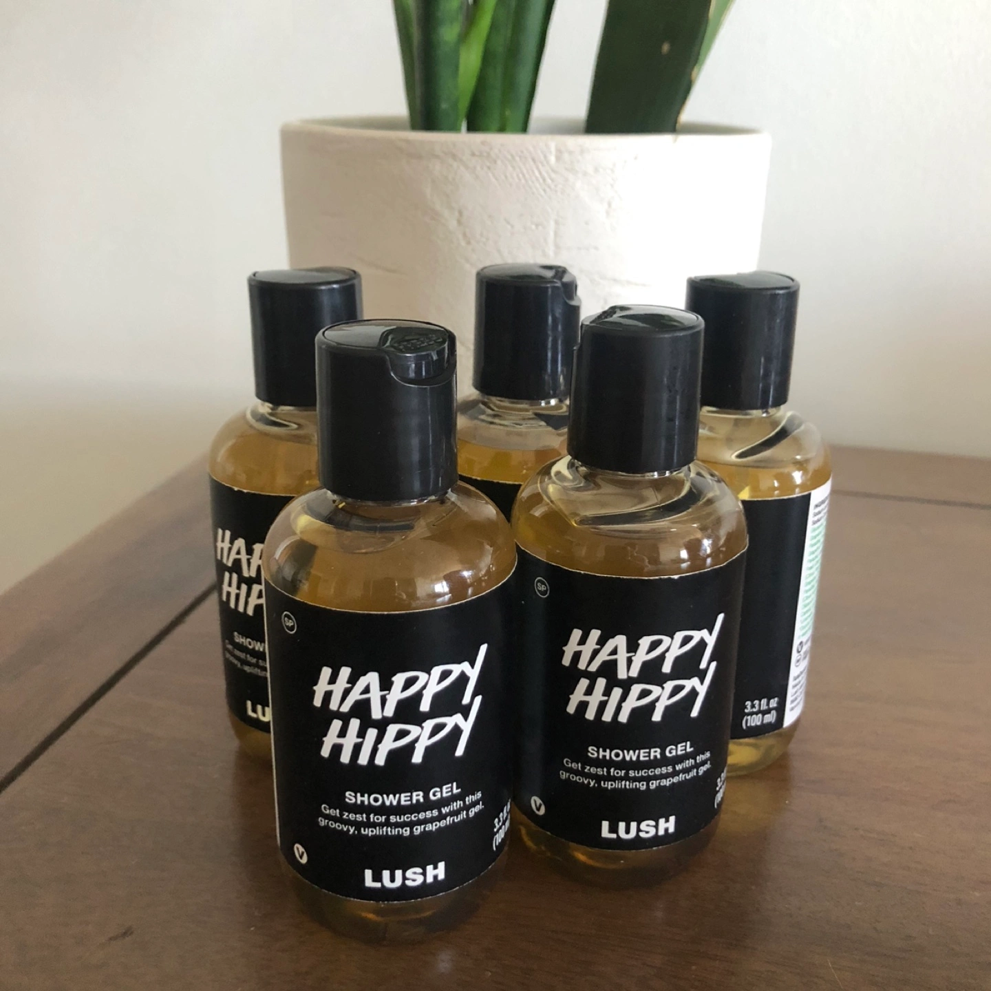 Selling 5 bottles (100 mL each) of Lush Happy Hippy shower gel! It's a groovy, uplifting grapefruit scent that's perfect for a little zest in your day.